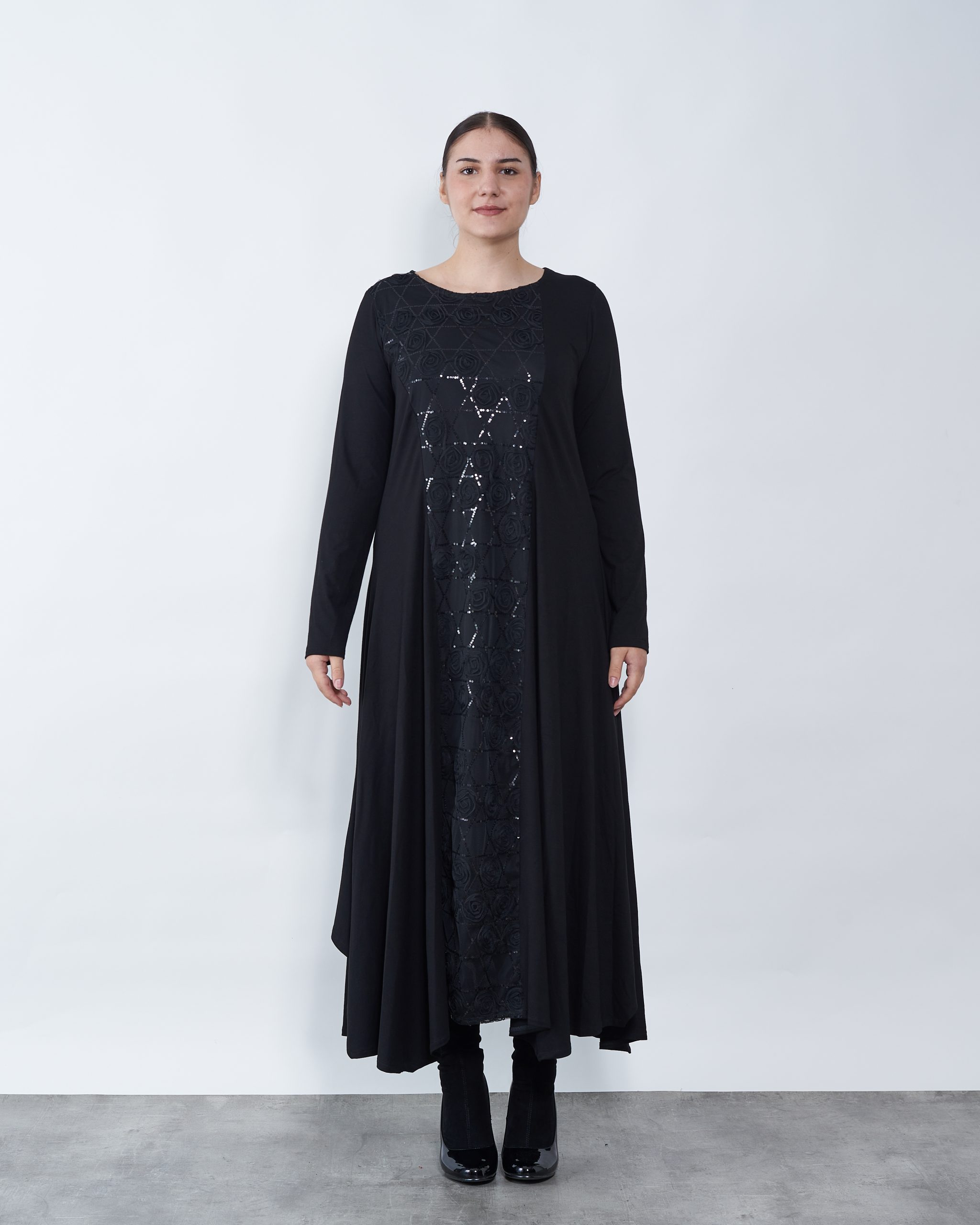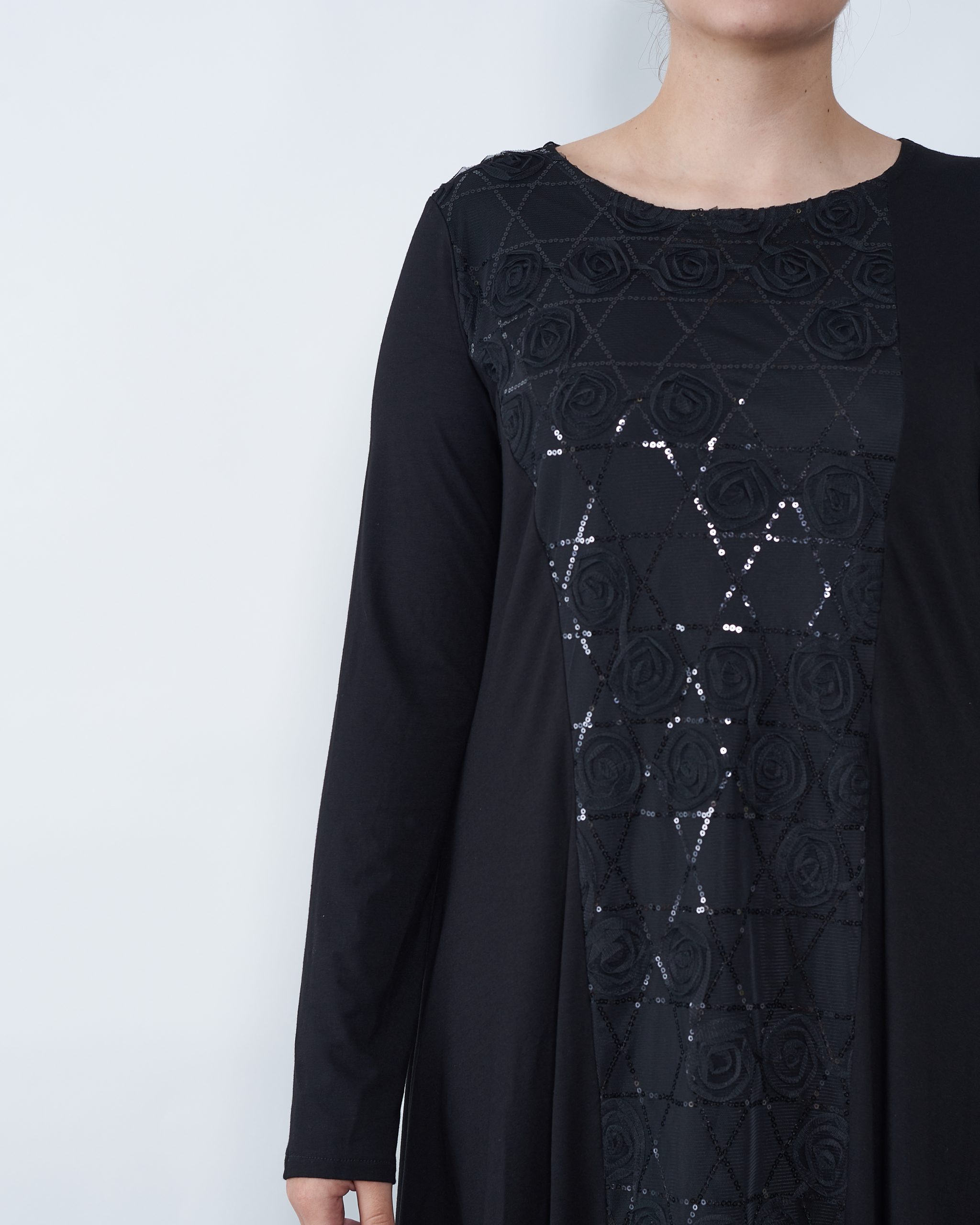 Haljinu krasi umetak od crne čipke koji vizualno izdužuje figuru.