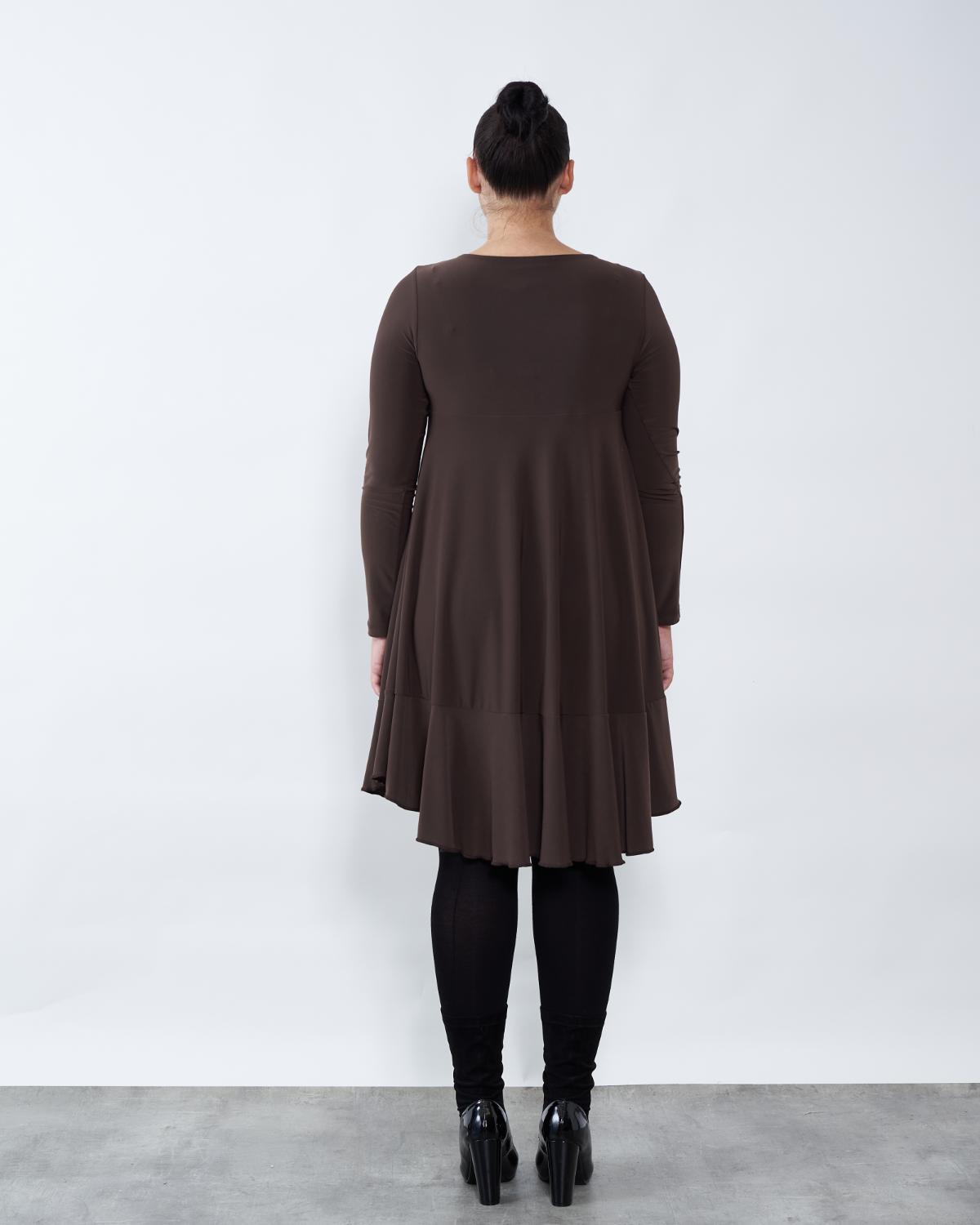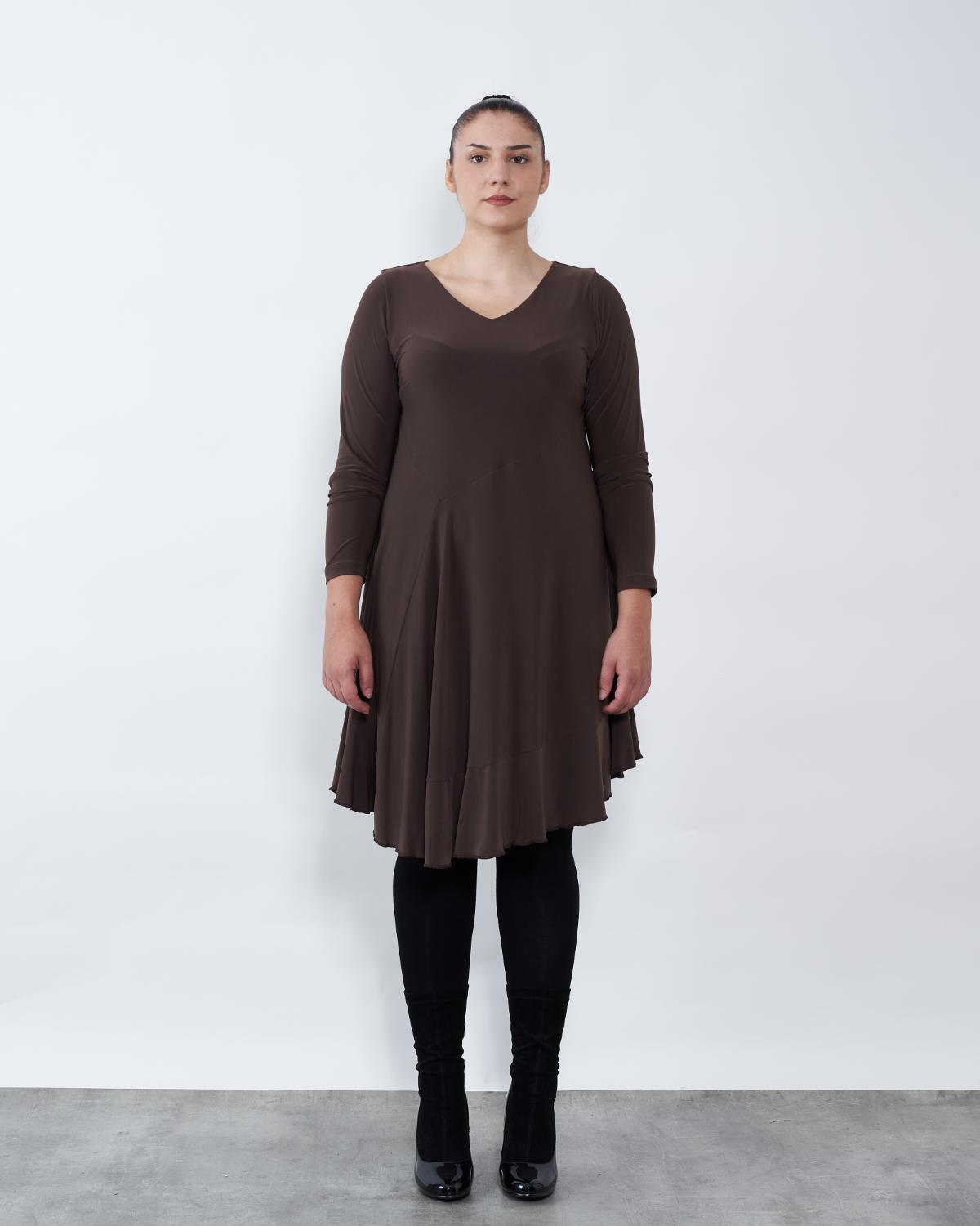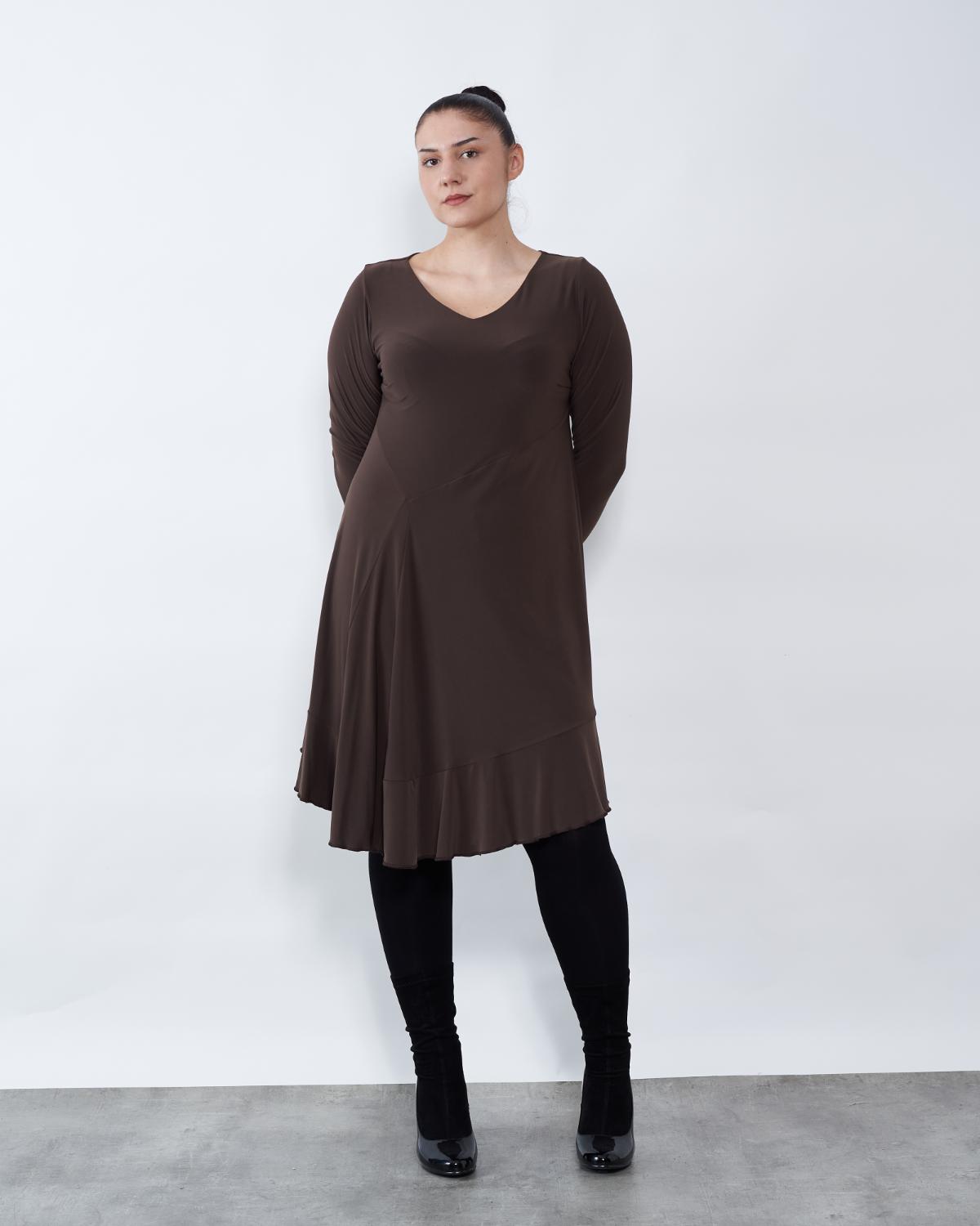 Haljina u gornjem dijelu prati liniju tijela te je u struku blago rezana u V.