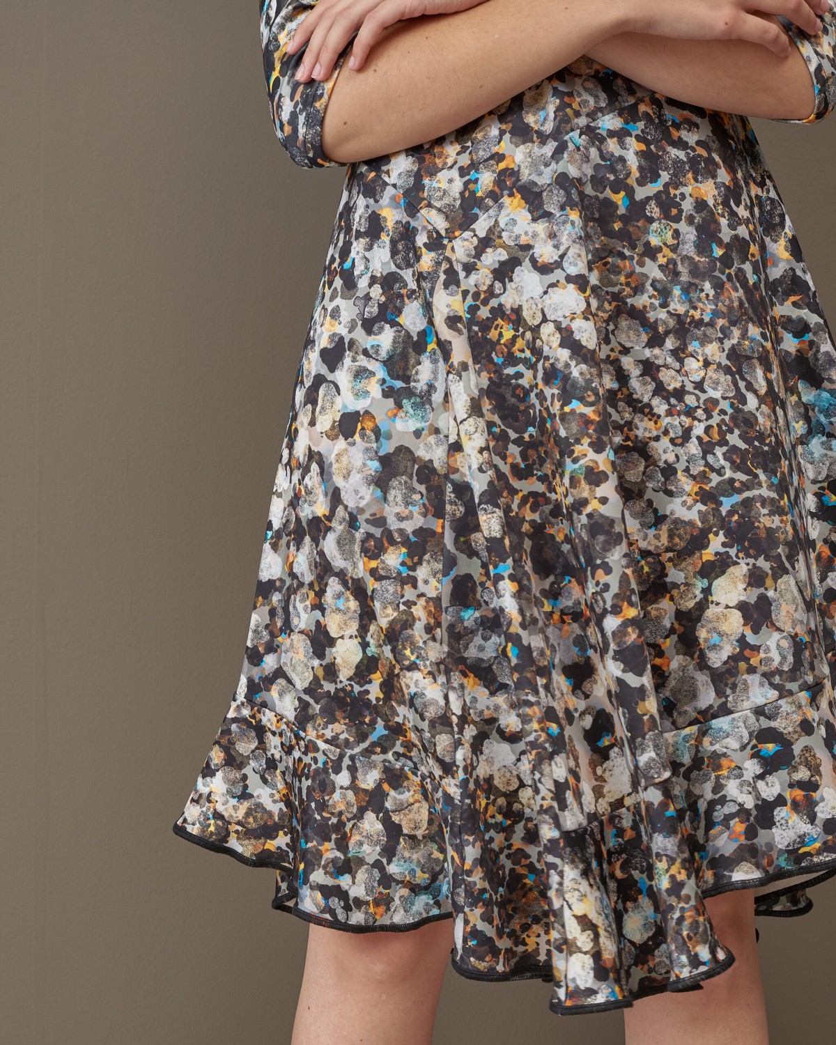 Uzorak tkanine vizualno dodatno skriva sve nedostatke u području struka i bokova.