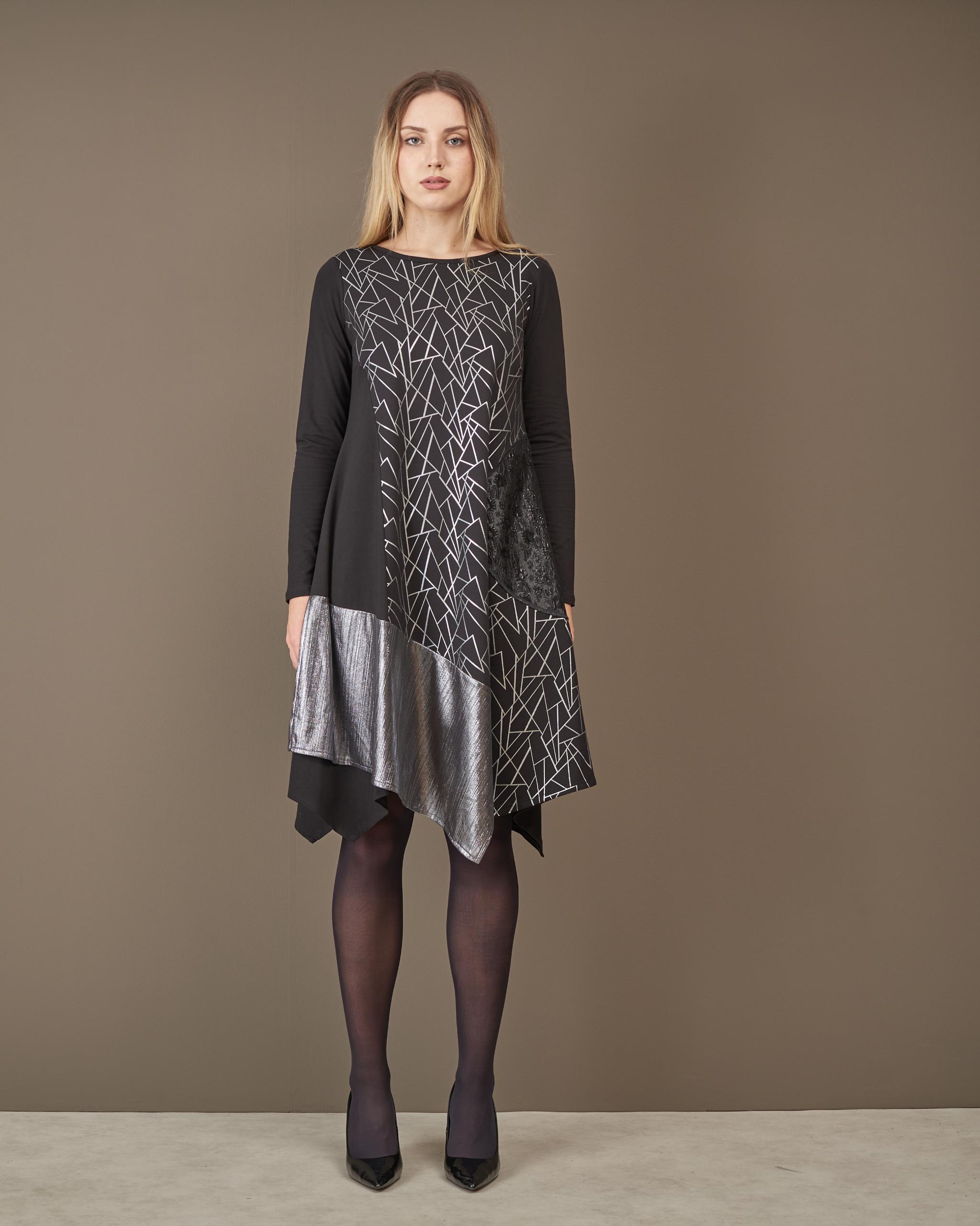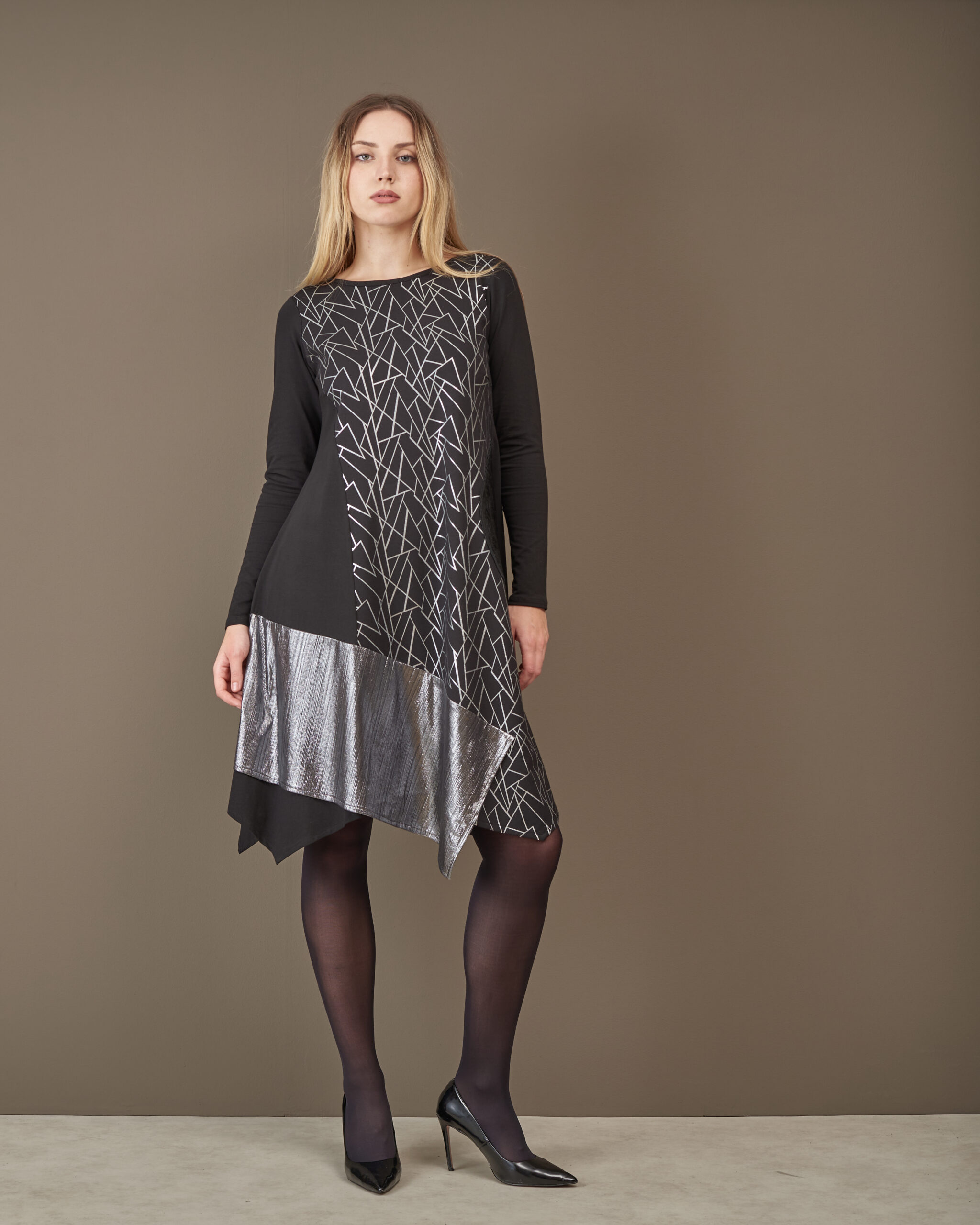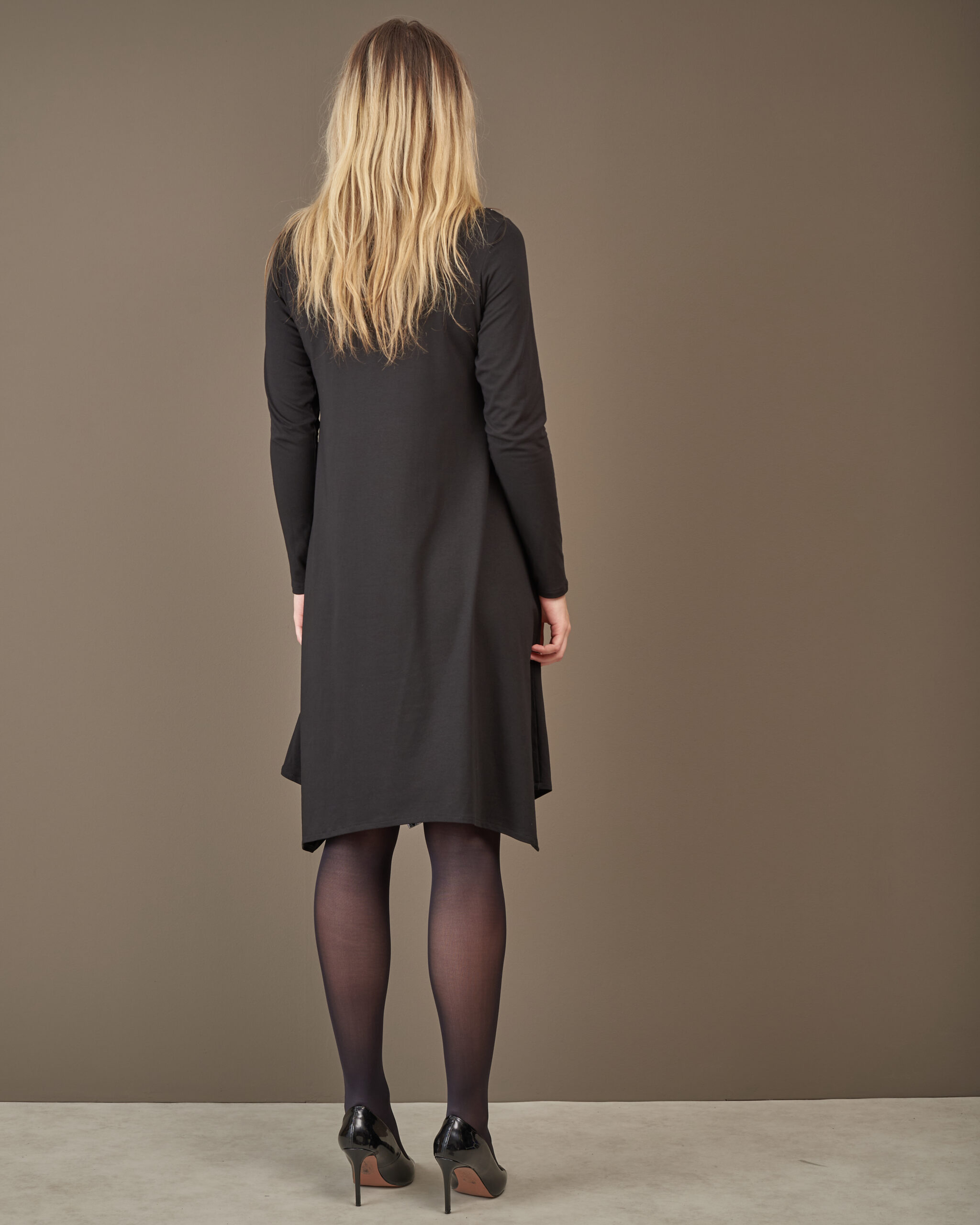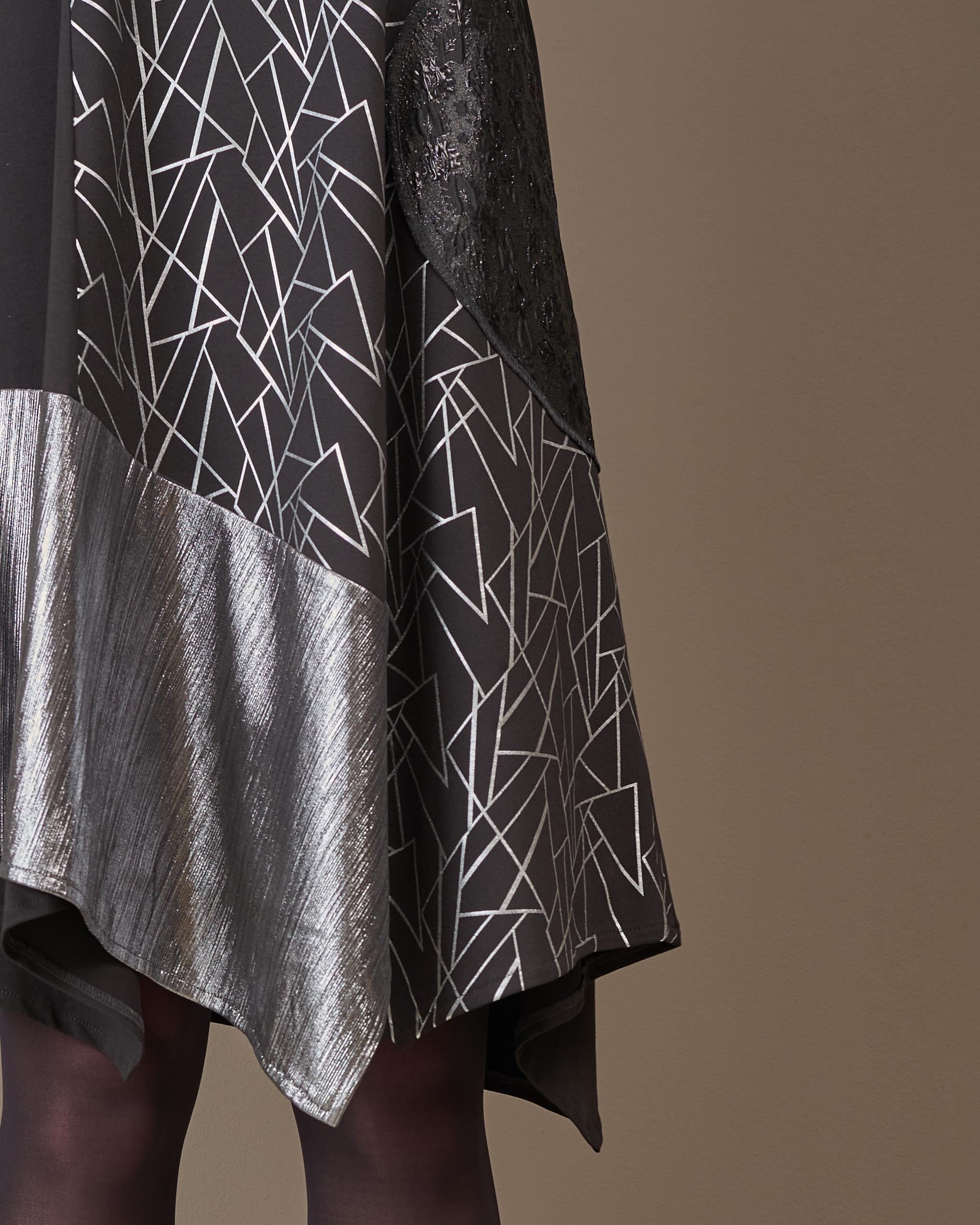 U prednjem dijelu haljina je obogaćena umetcima koji dodatno vizualno stanjuju figuru.