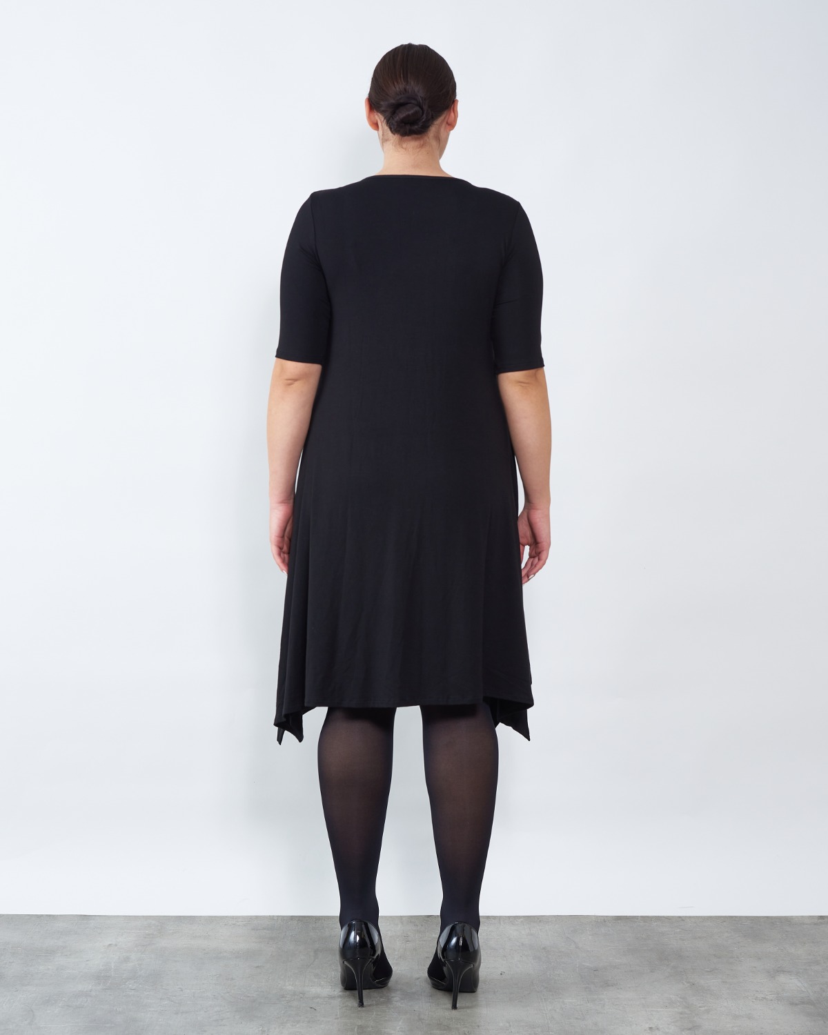 Haljina završava asimetrijom.