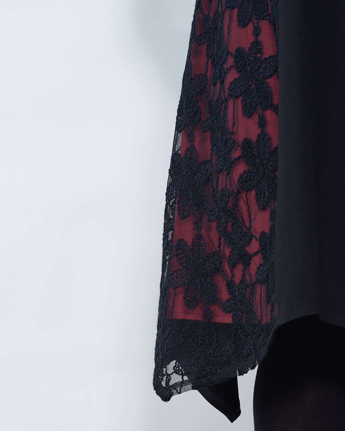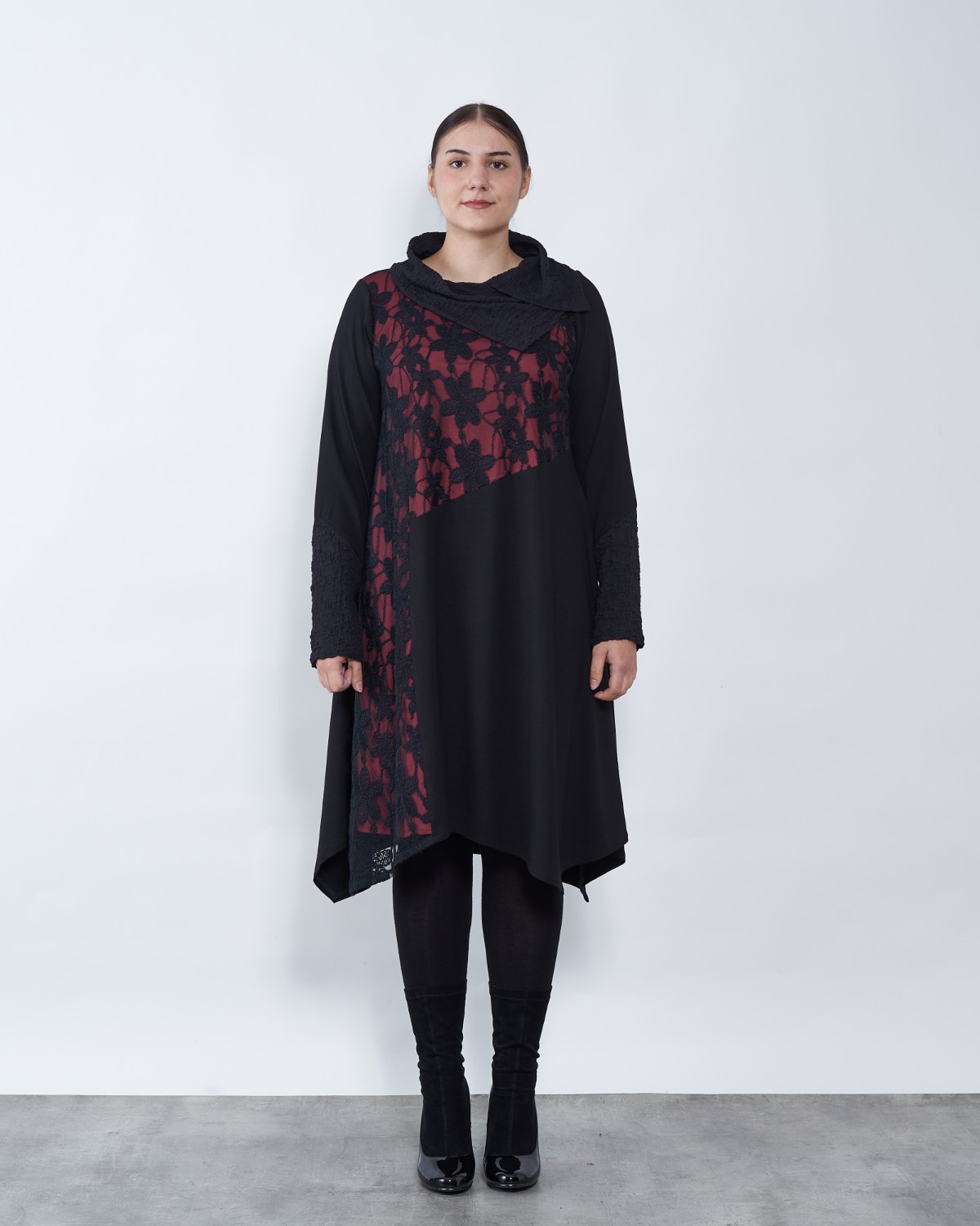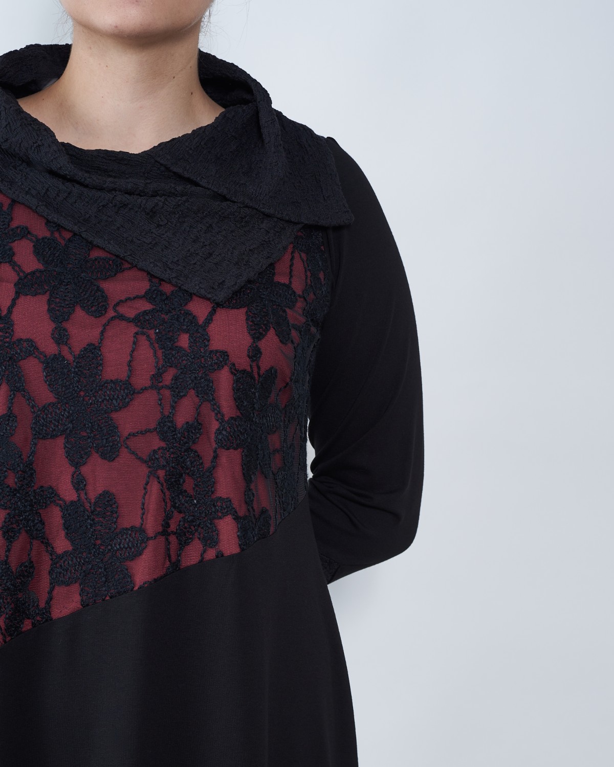 Monotoniju crne boje razbija crvena koja je prekrivena bogatom crnom čipkom.