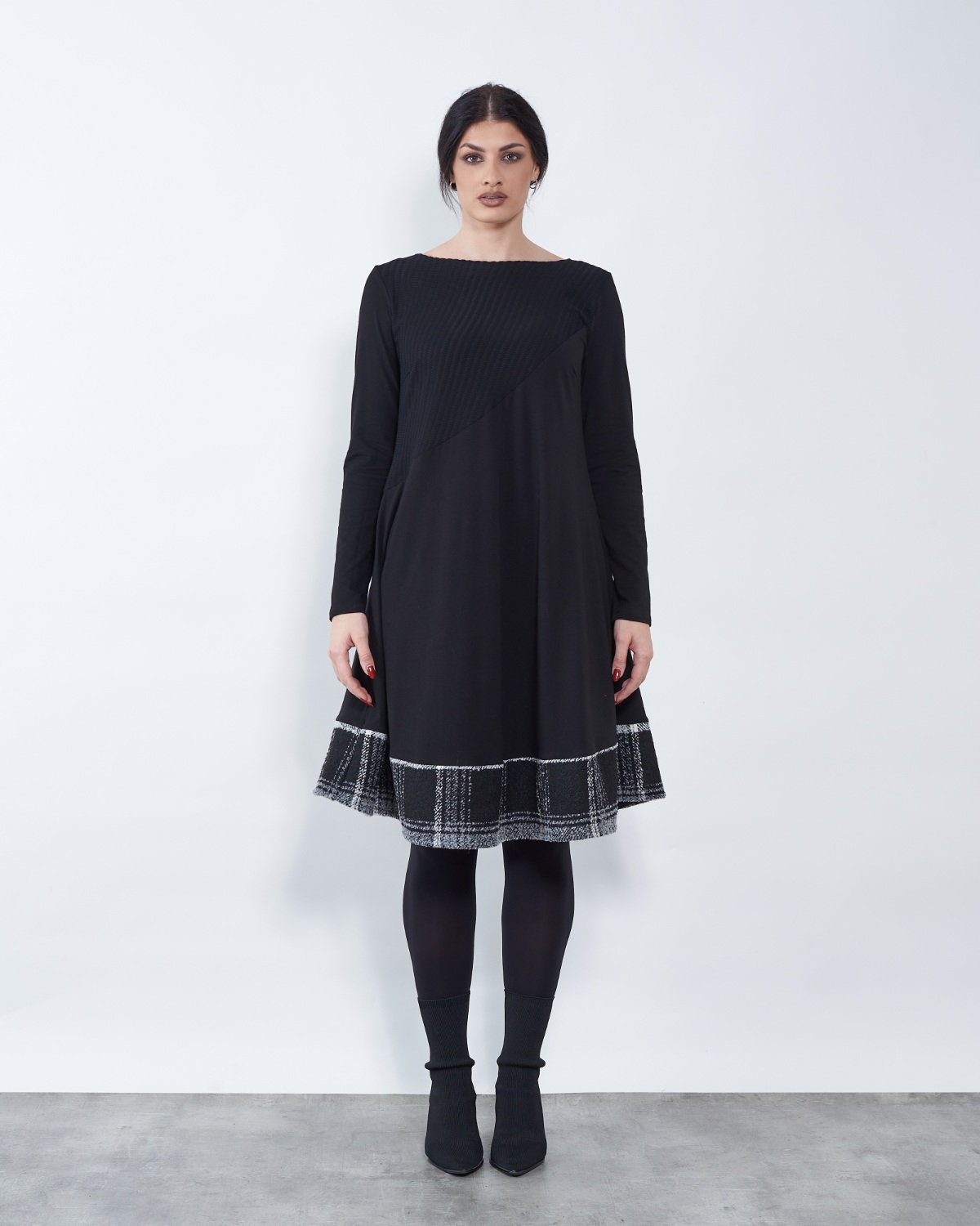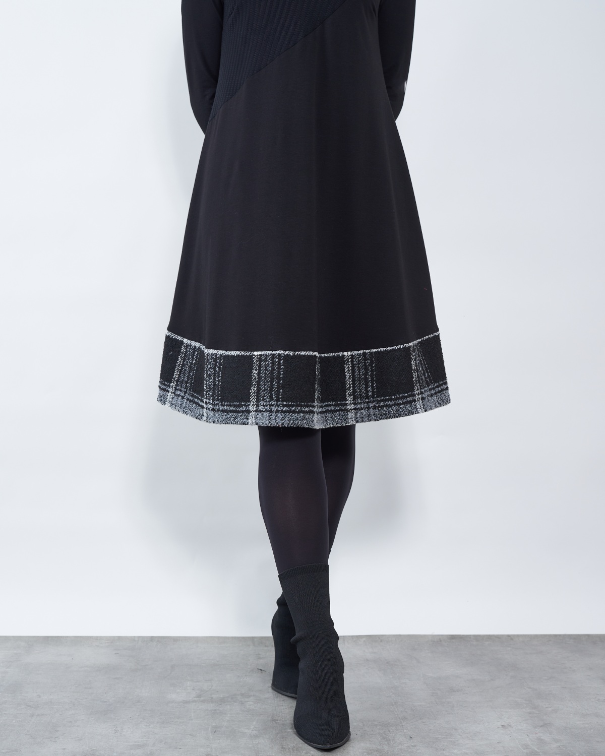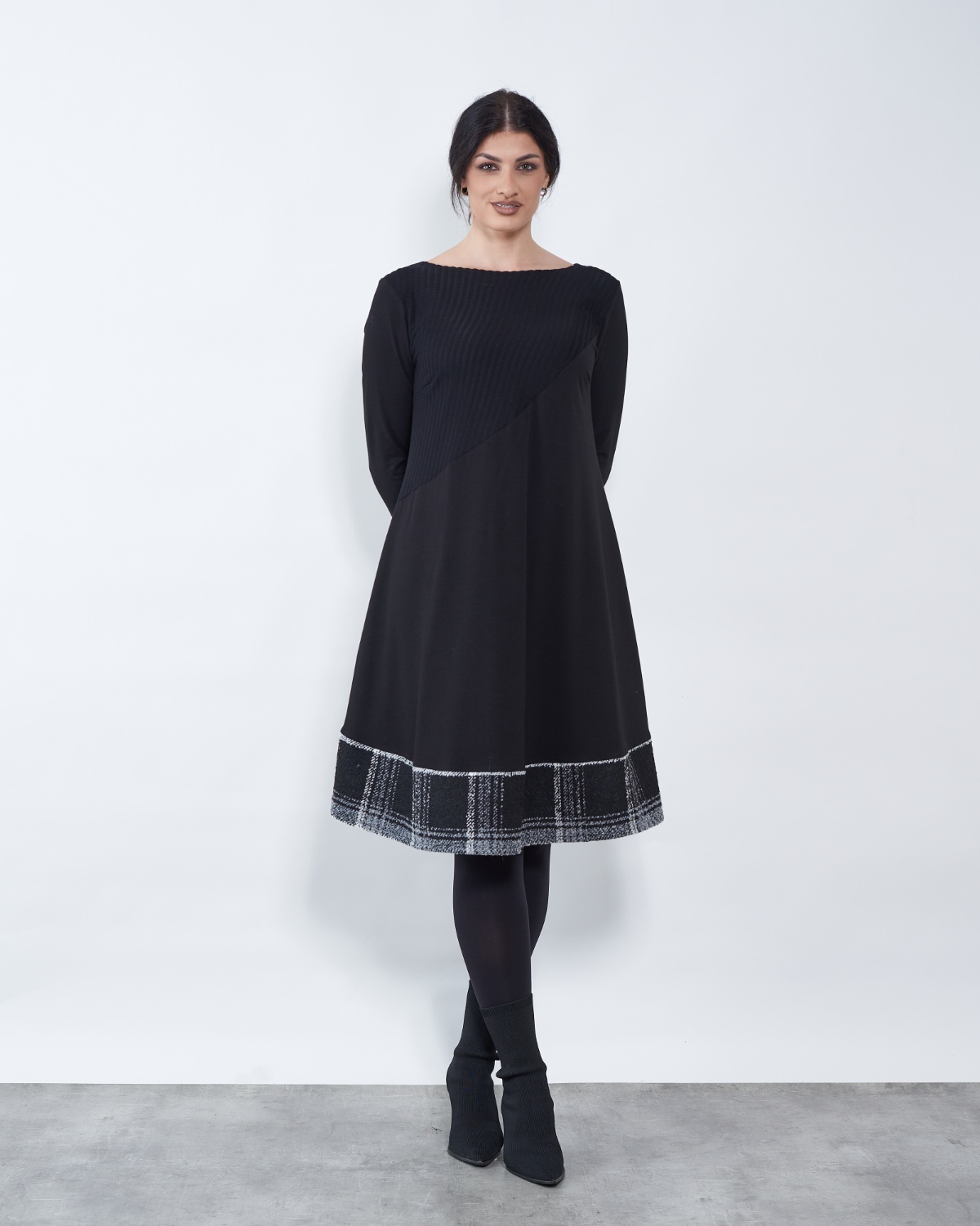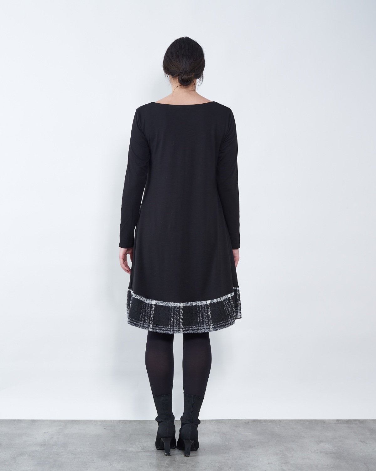 Haljina završava bijelo-sivim dodatkom.