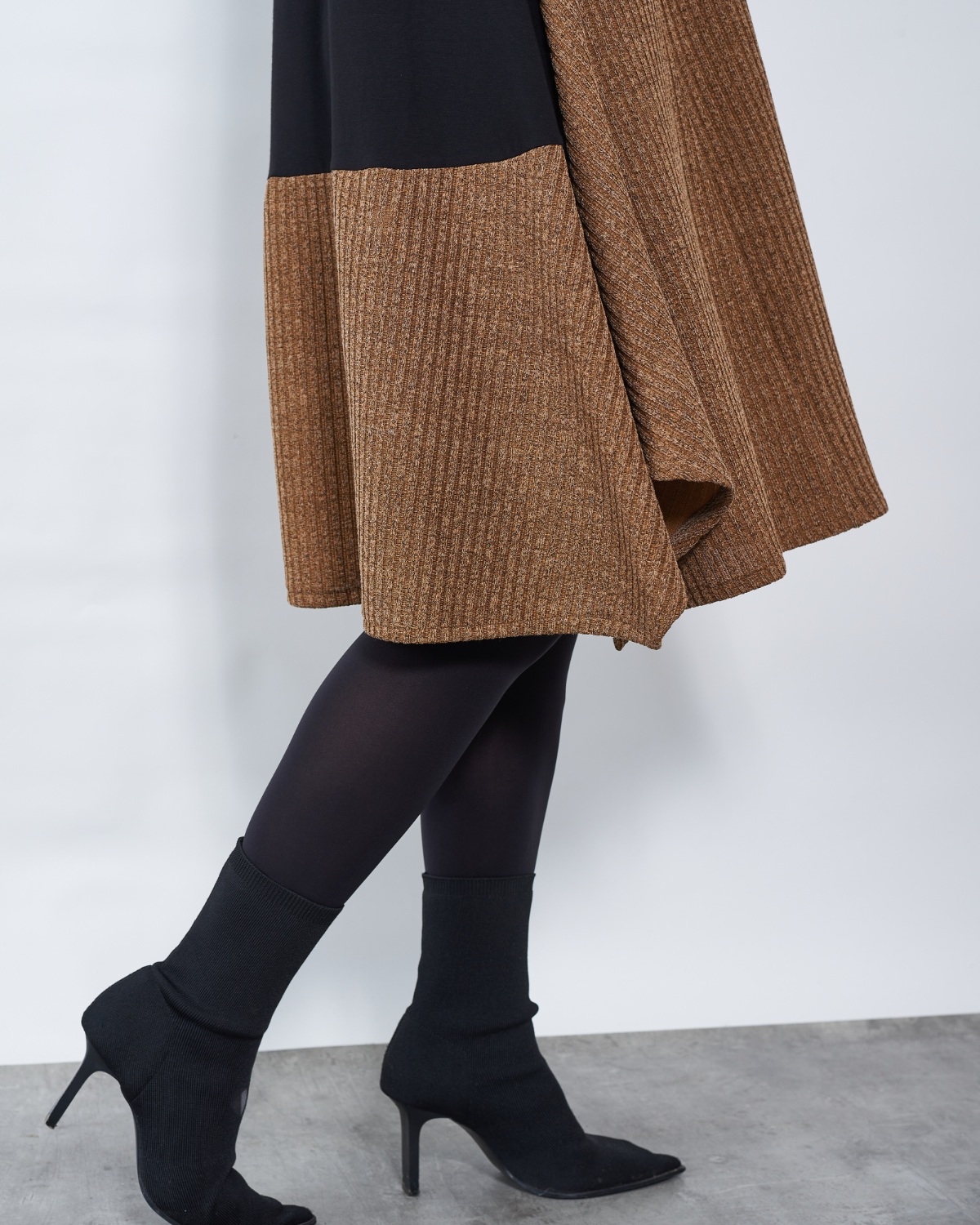 Kombinacija dviju tkanina potpomaže sakrivanju nedostataka u području struka i bokova.