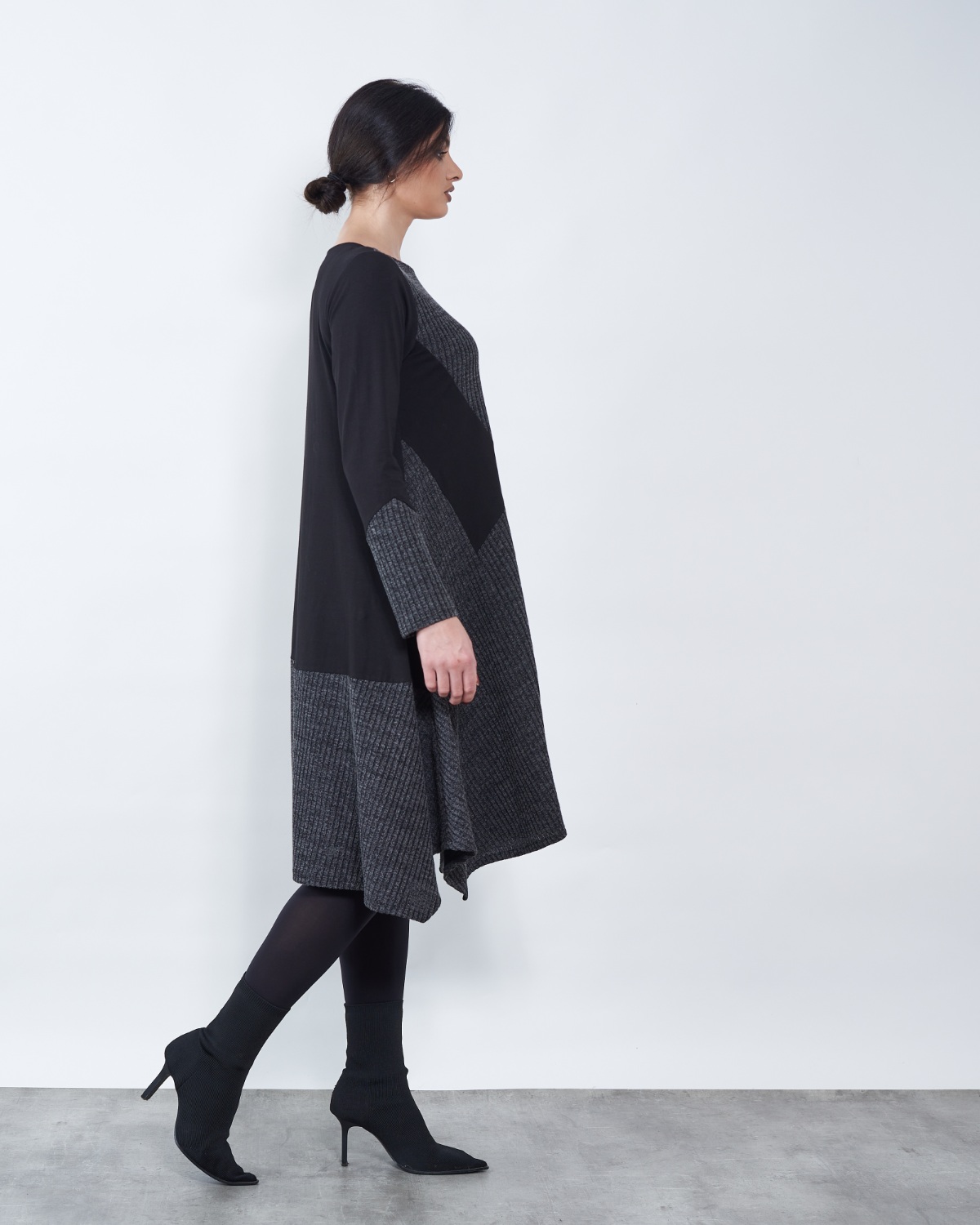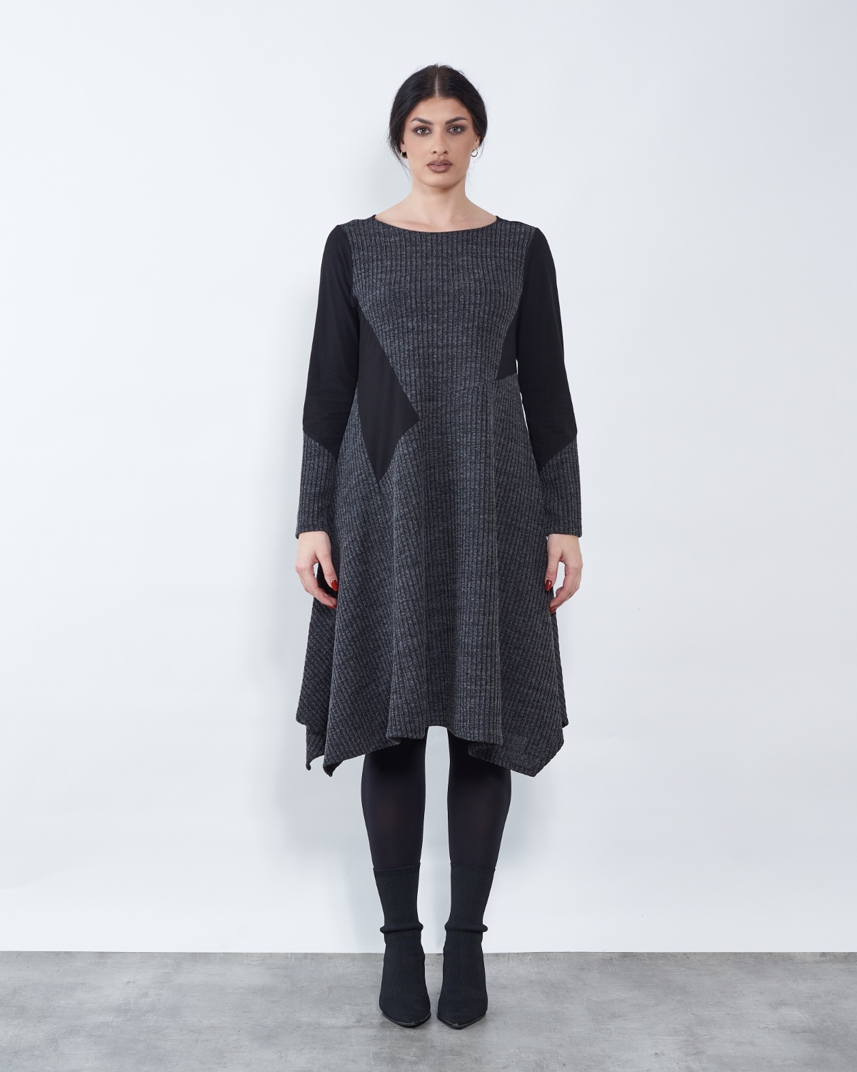 Haljina u gornjem dijelu prati liniju tijela , a u donjem se širi u blagi "A" te završava asimetrijom.
