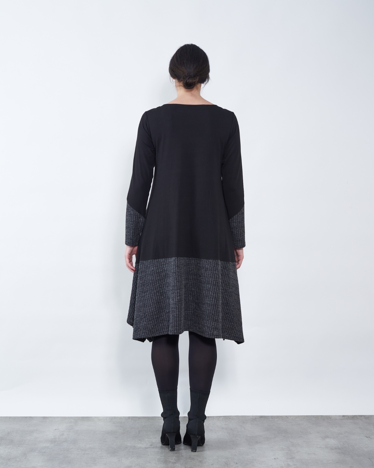 Kombinacija dviju tkanina potpomaže sakrivanju nedostataka u području struka i bokova.