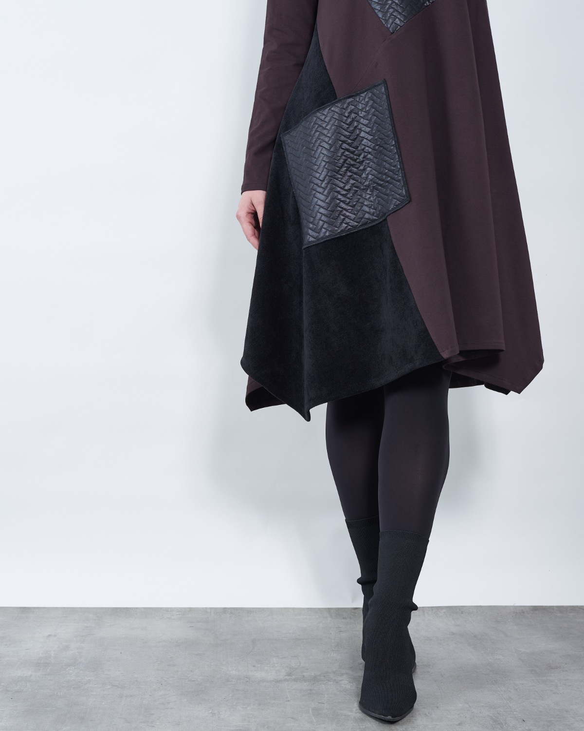 Kombinacija dviju tkanina potpomaže sakrivanju nedostataka u području struka i bokova.
