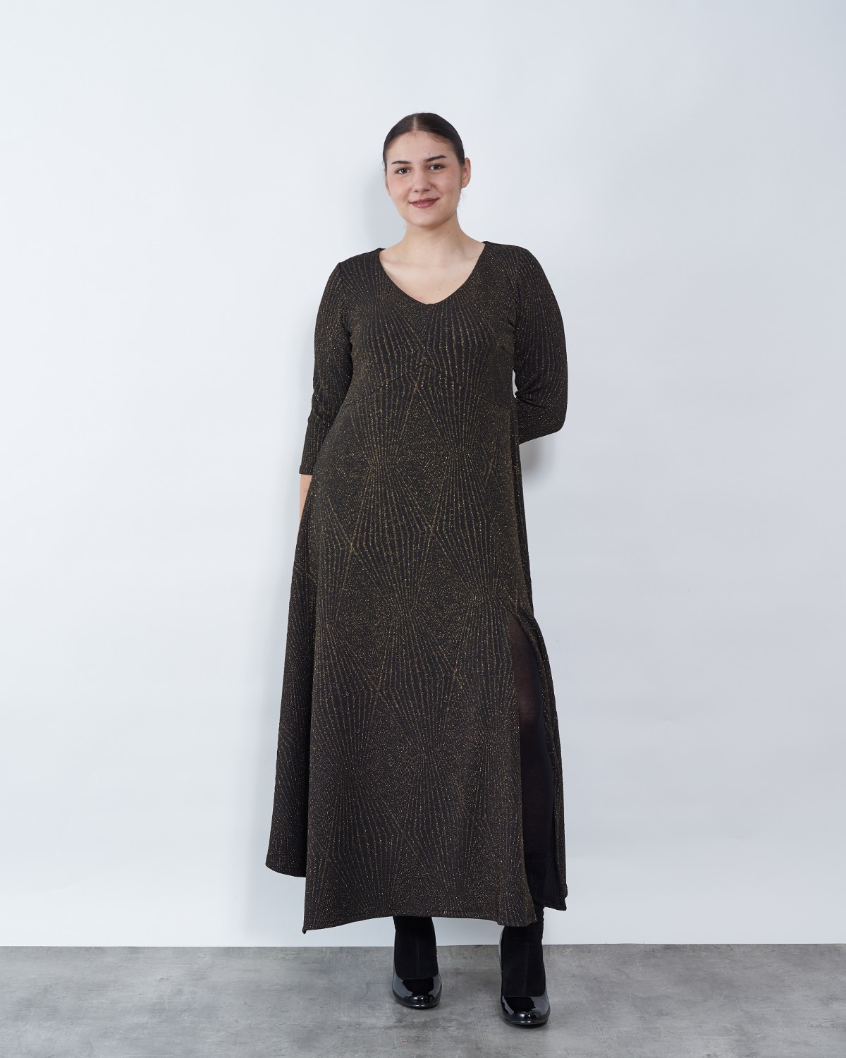 Haljina sa "V" izrezom na lijevoj strani ima rasporak.
