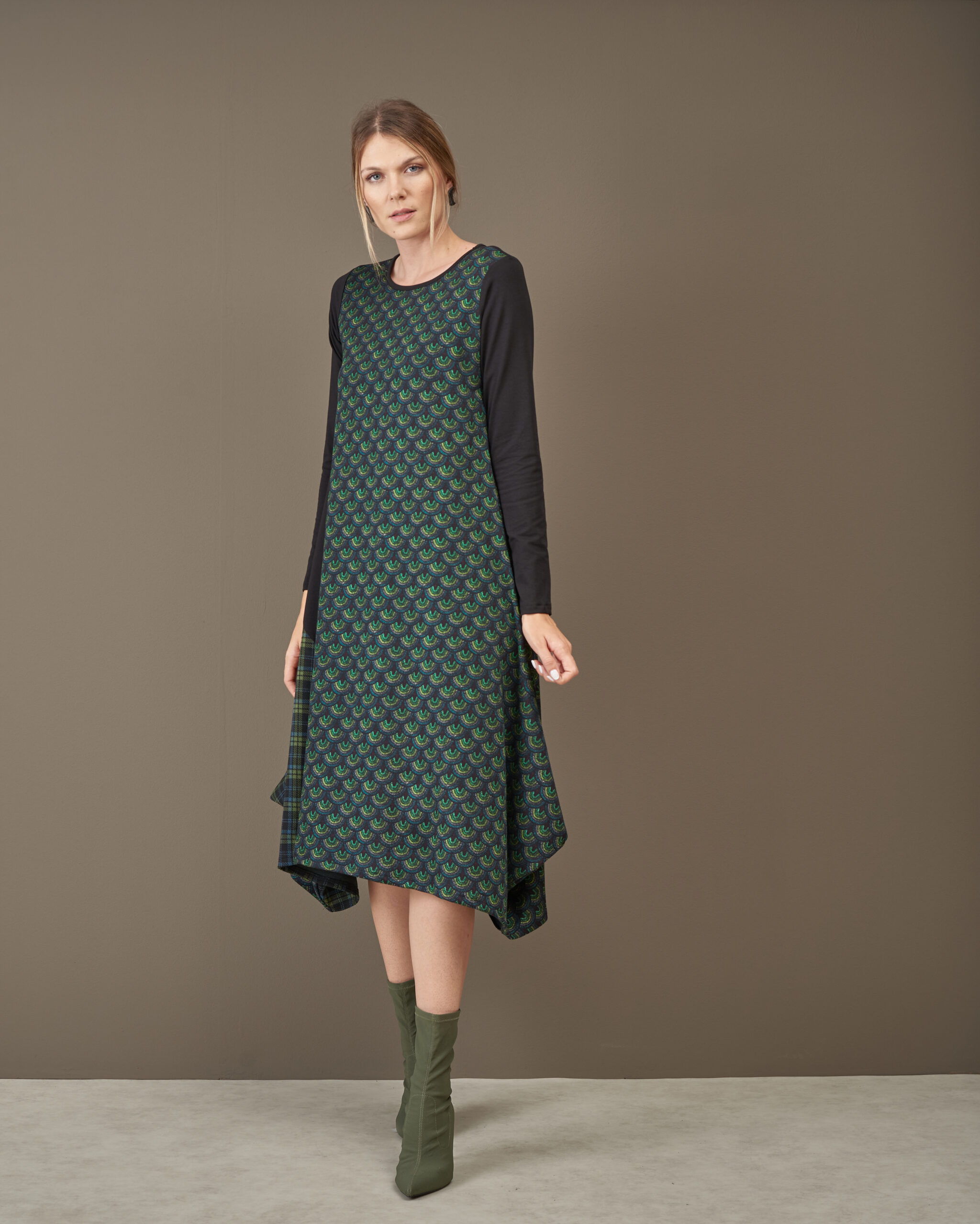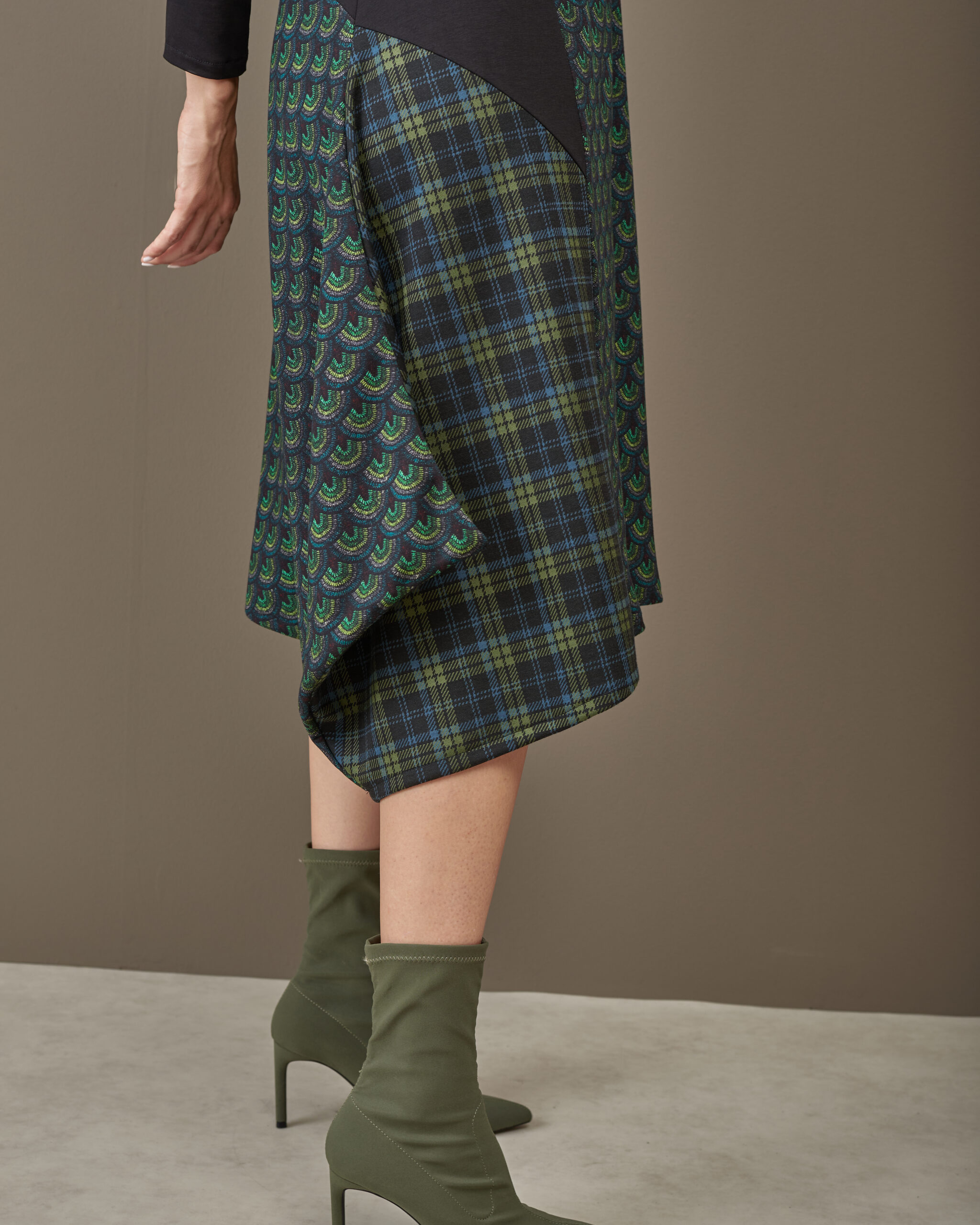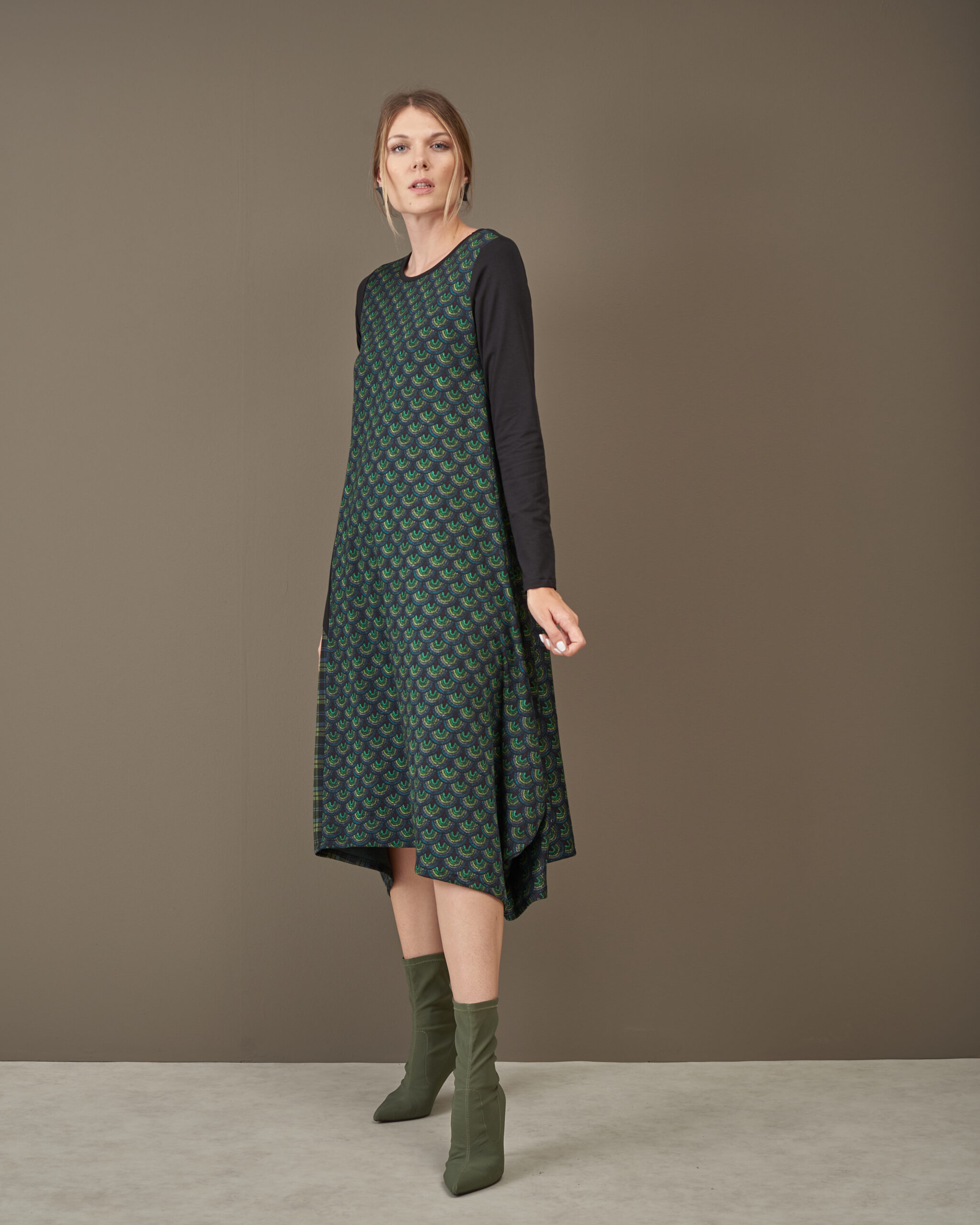 Haljina završava asimetrijom.