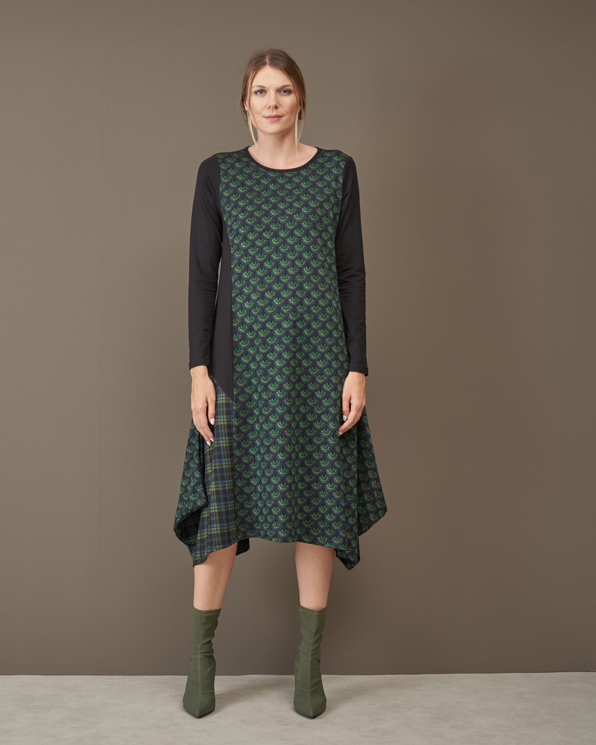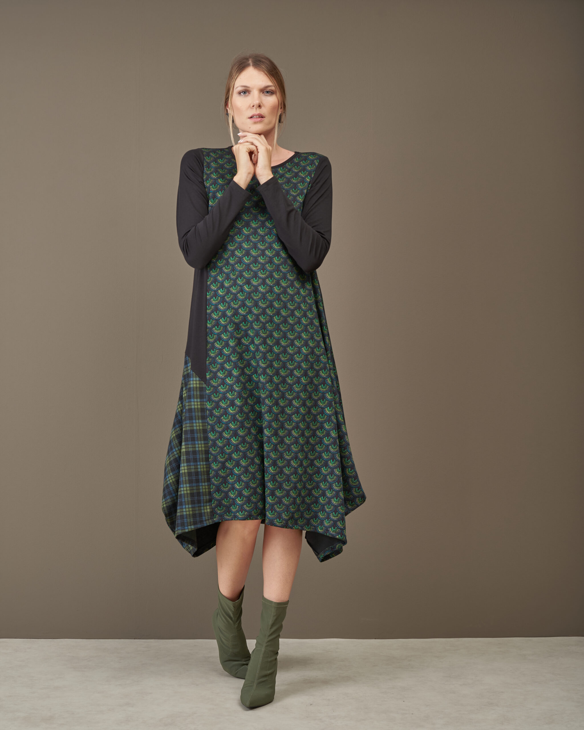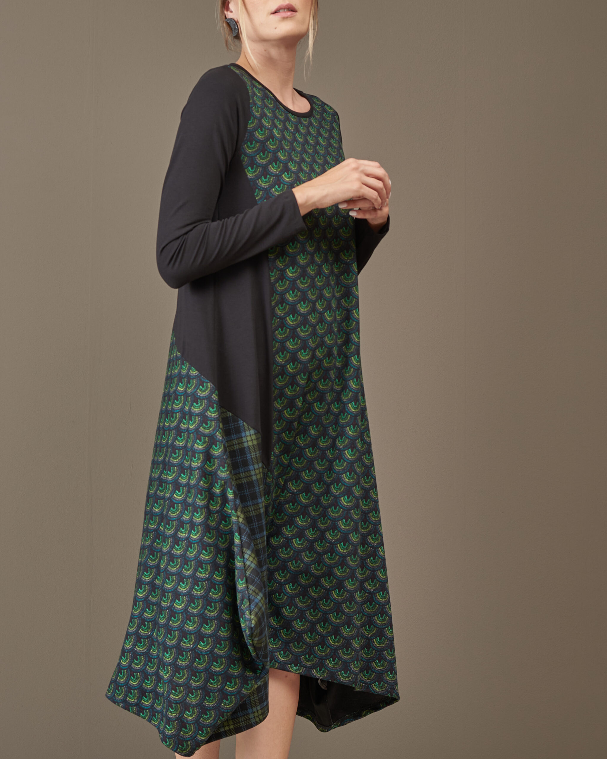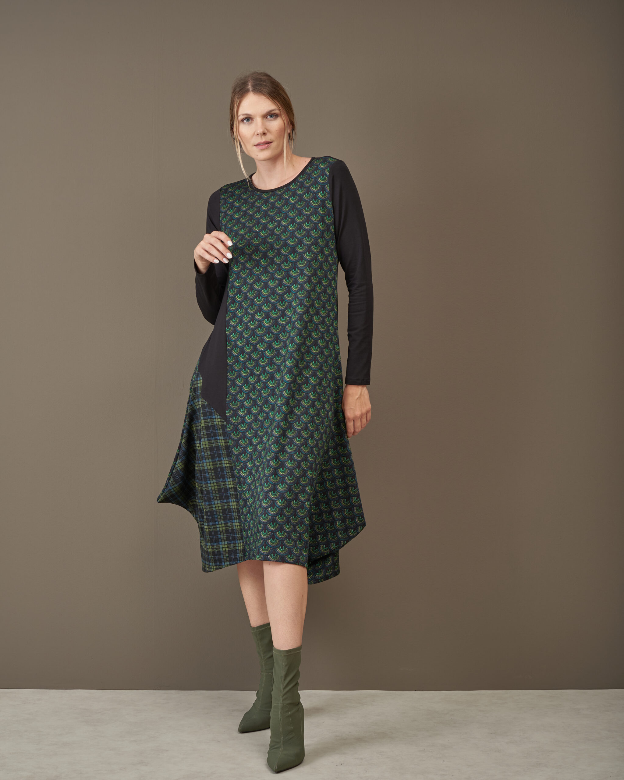 Haljina završava asimetrijom.