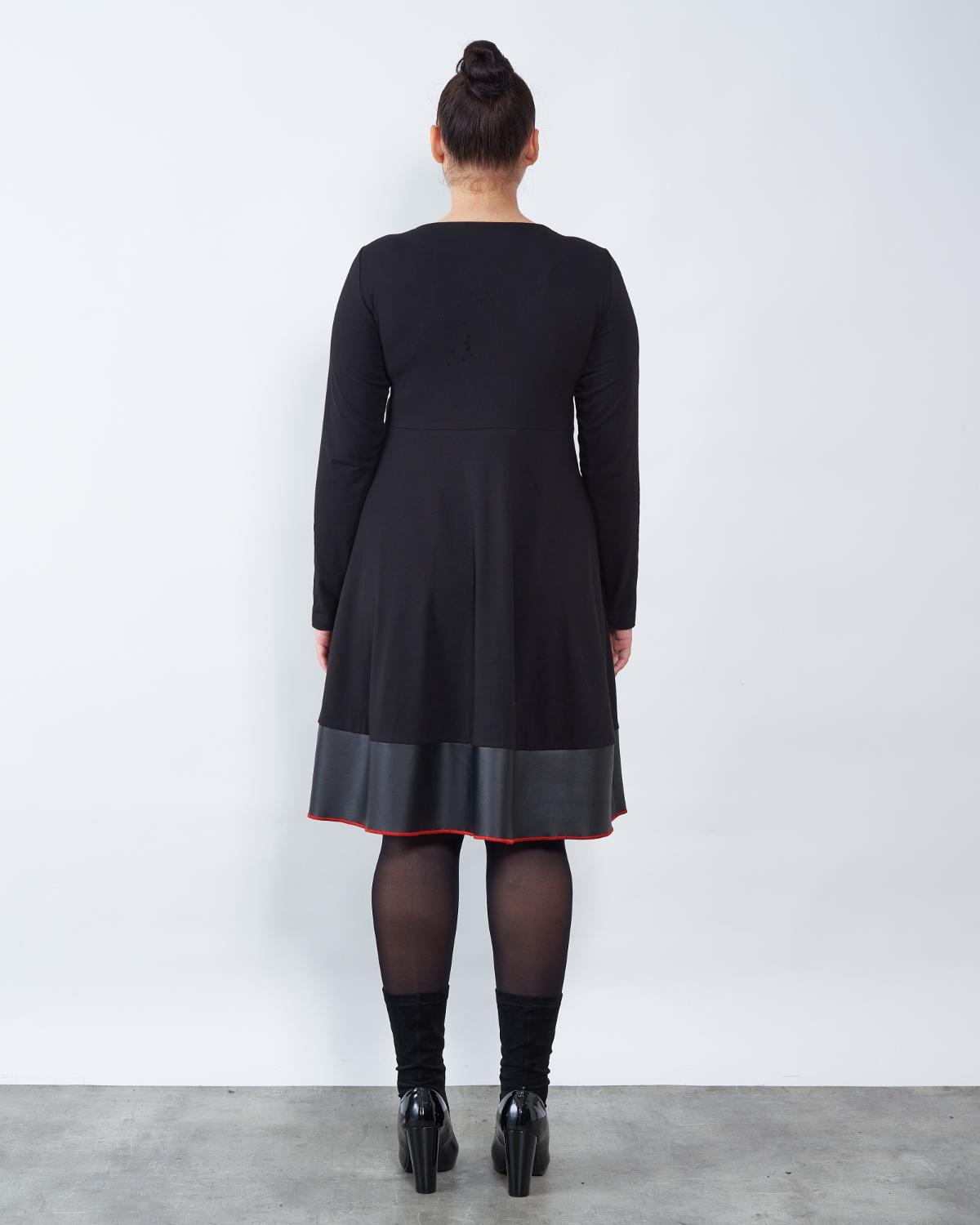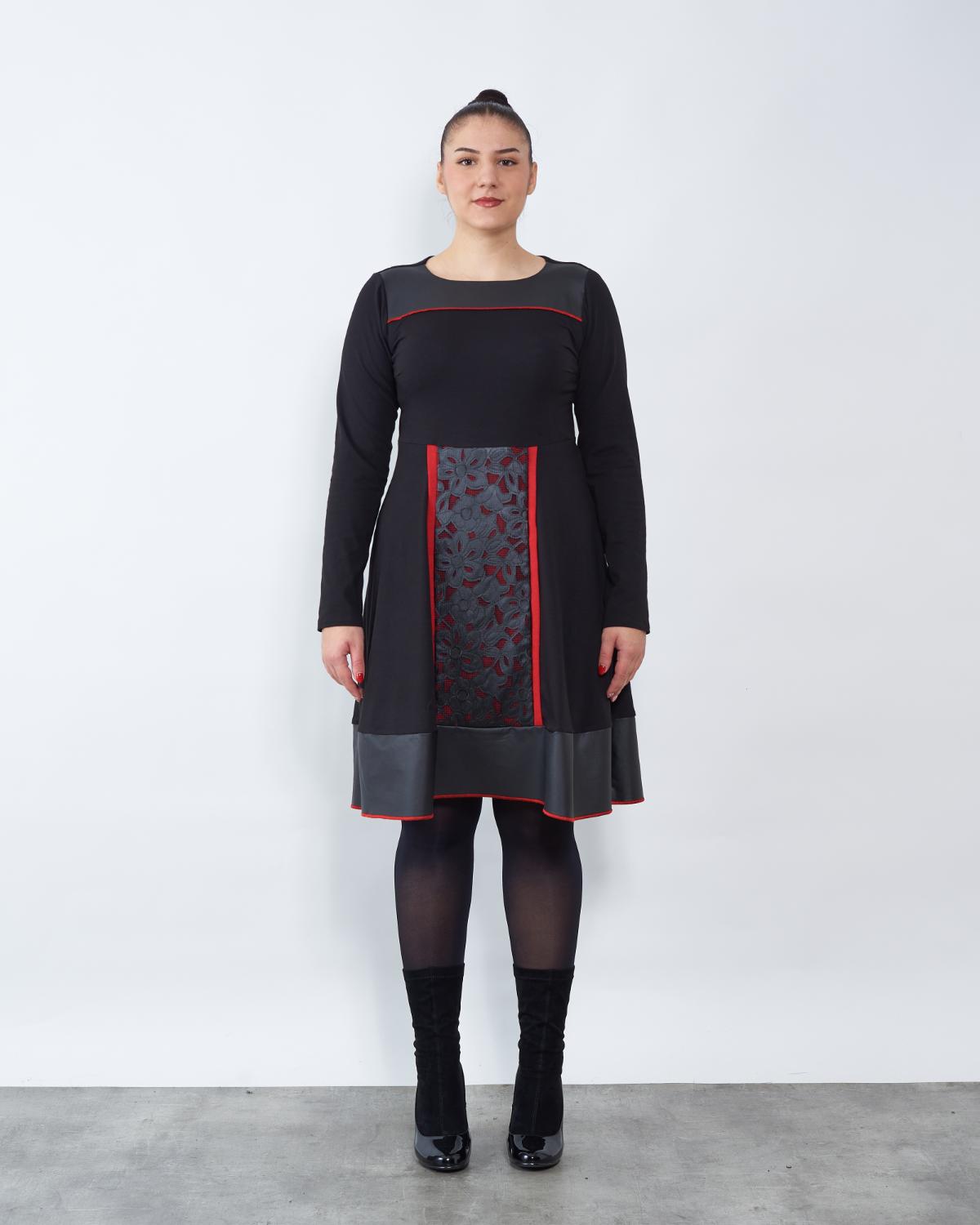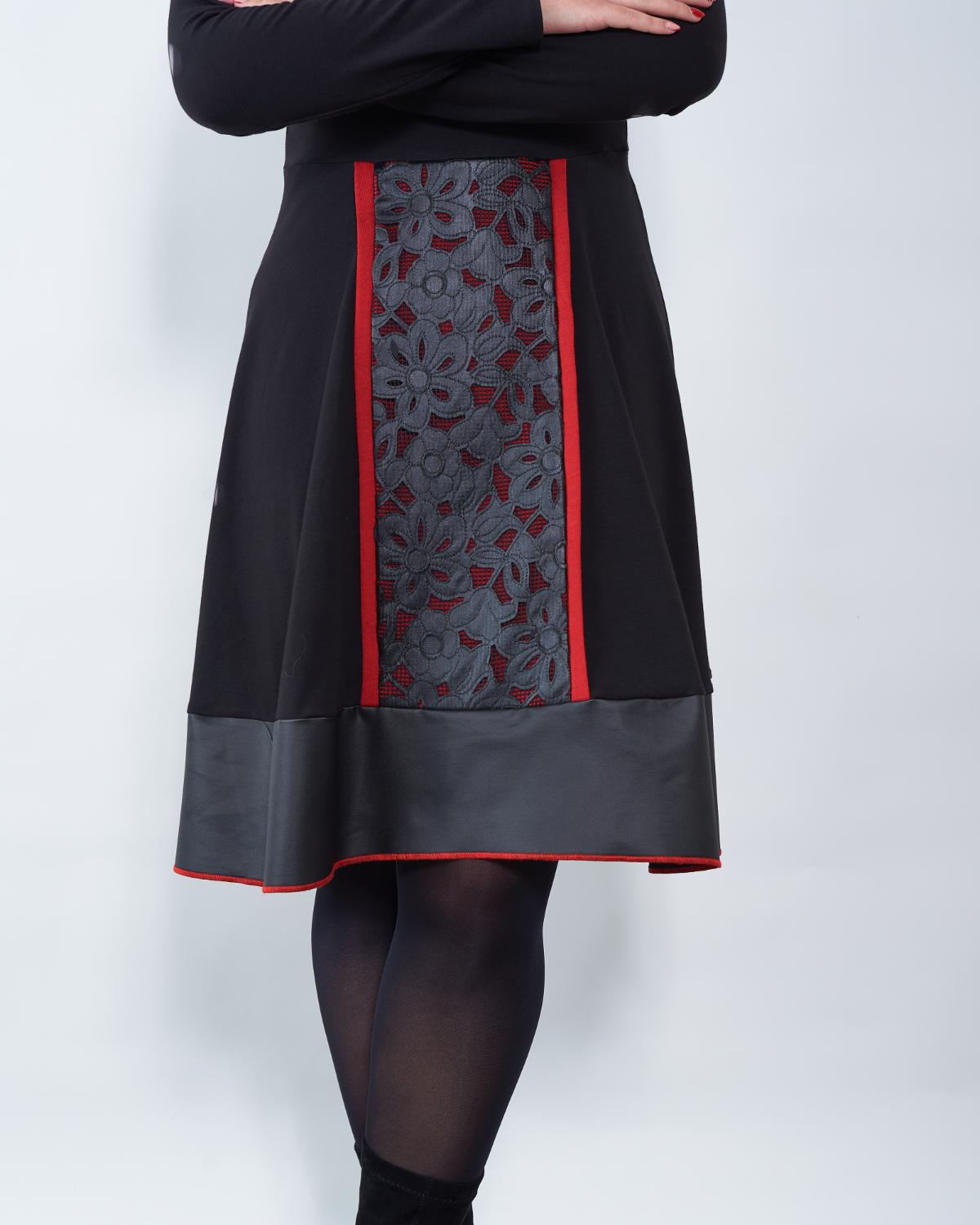 Model koji dobro prekriva nedostatke u području struka i bokova krase umetci od eko kože, te crveni obrubi.