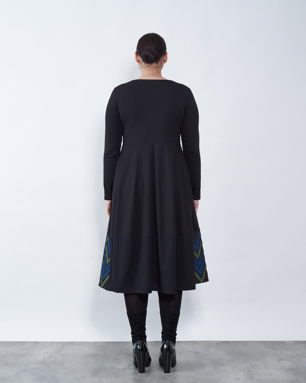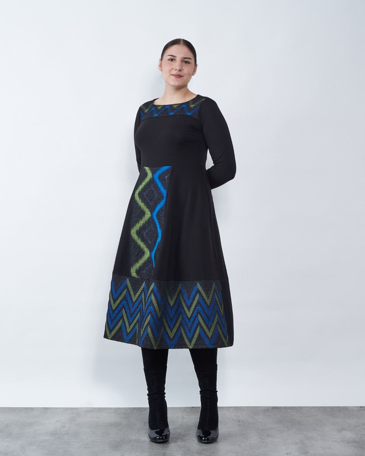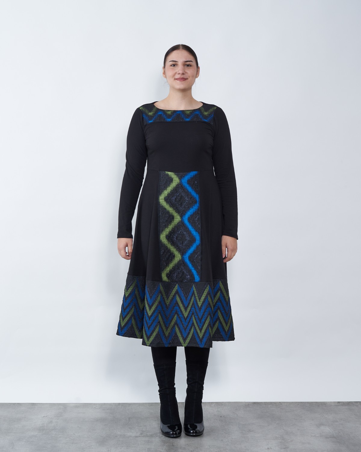 Model koji dobro prekriva nedostatke u području struka i bokova krase umetci u kombinaciji plave i zelene boje.