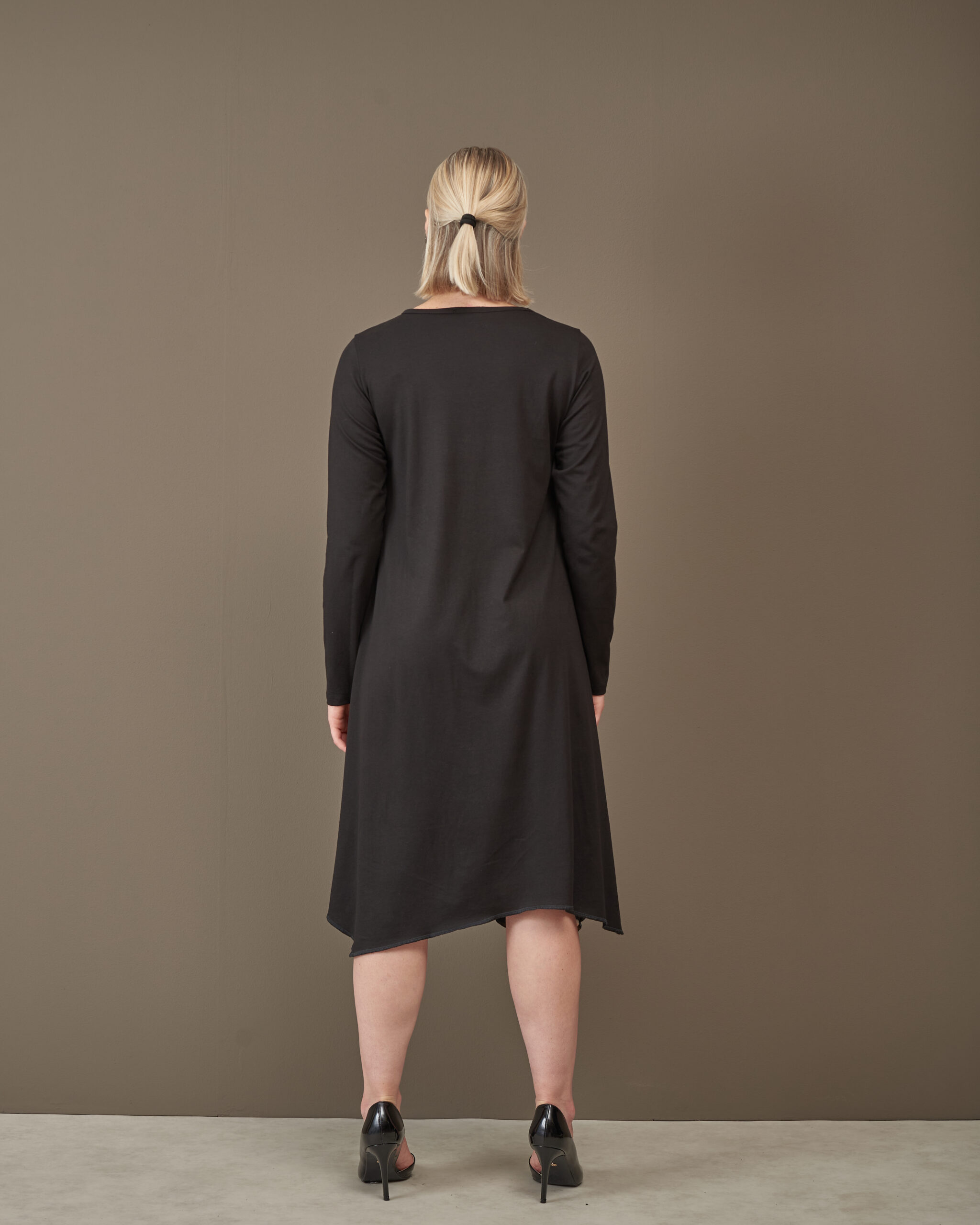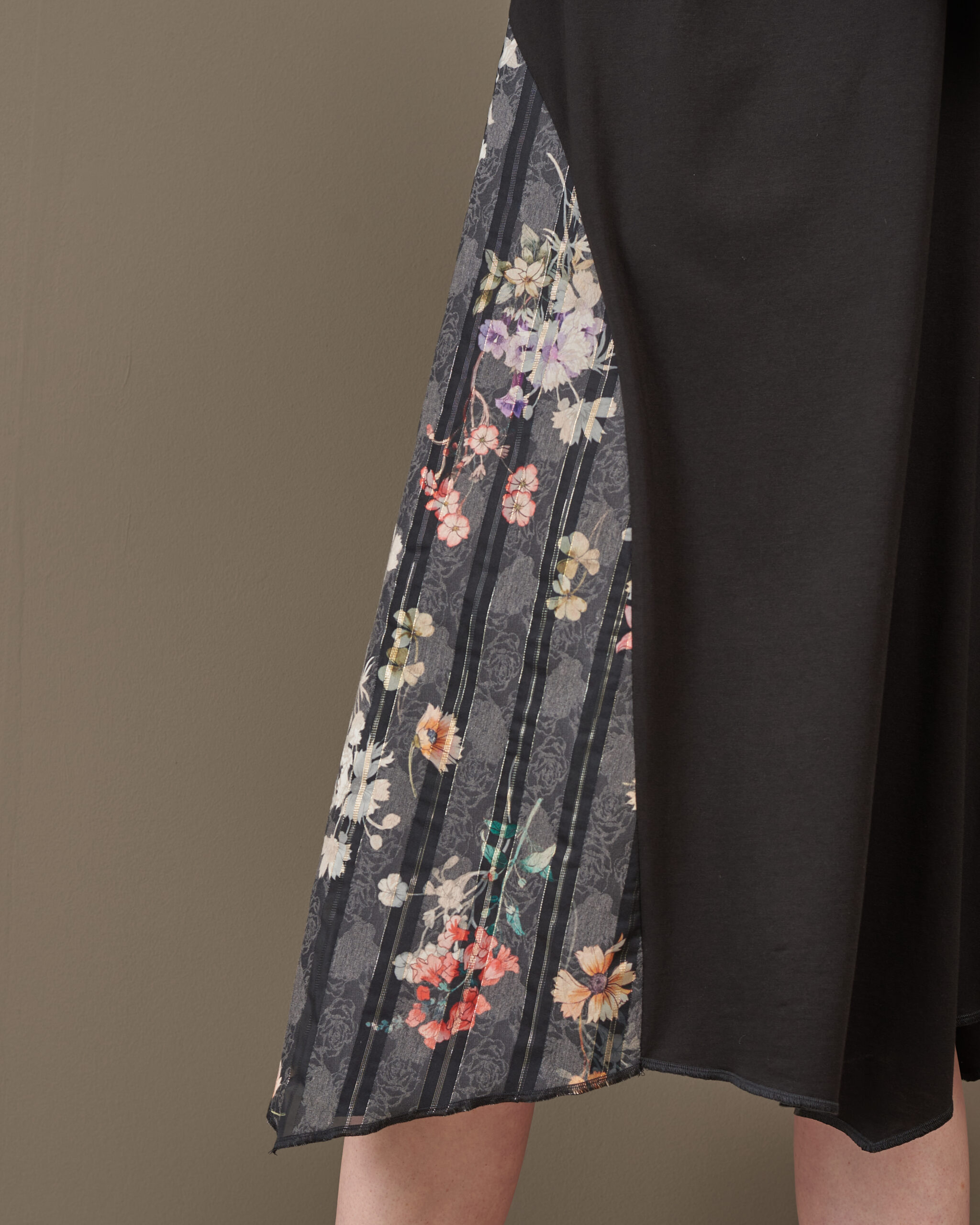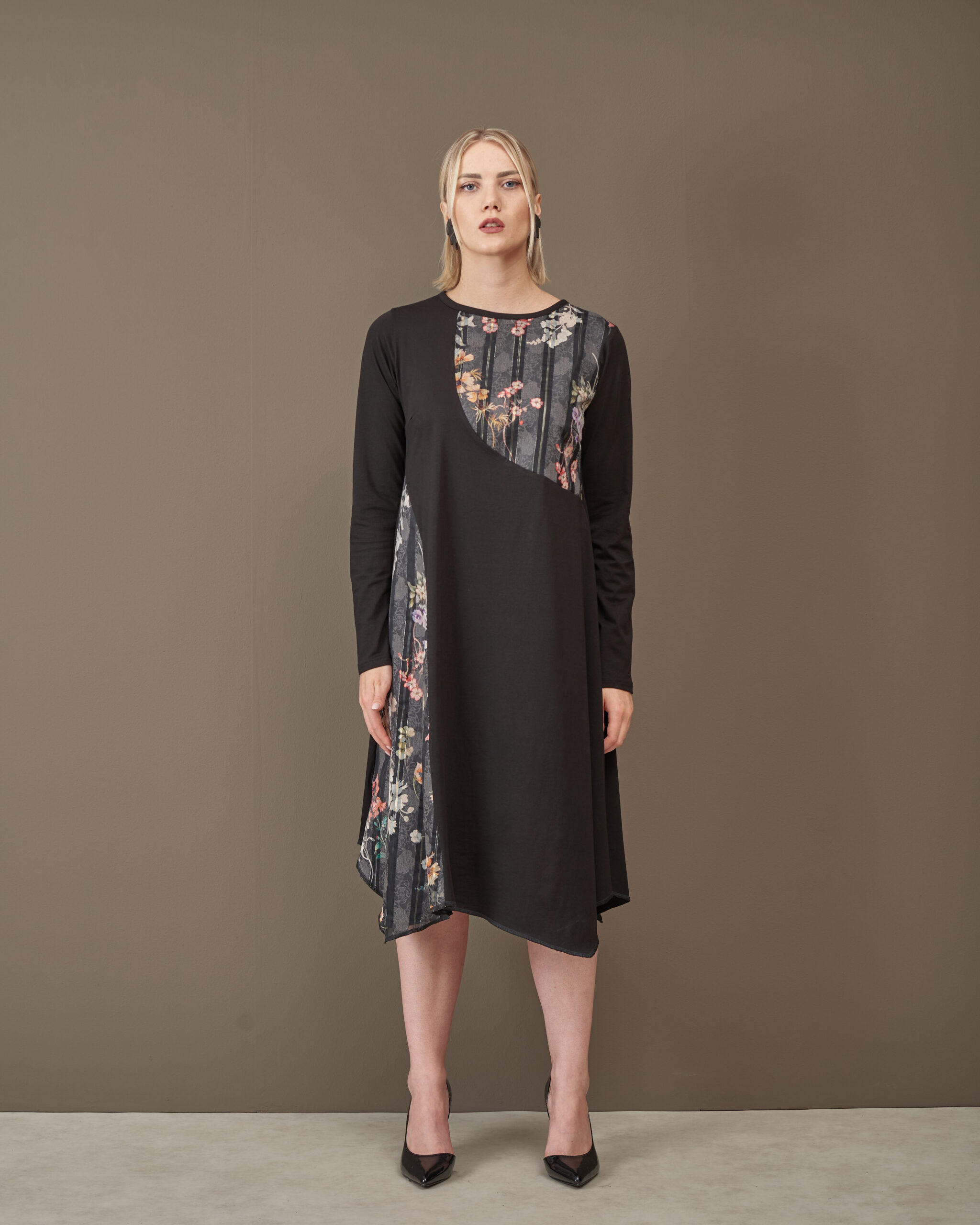 Haljina A kroja sa cvjetnim umetcima koji potpomažu vizualnom smanjivanju figure.