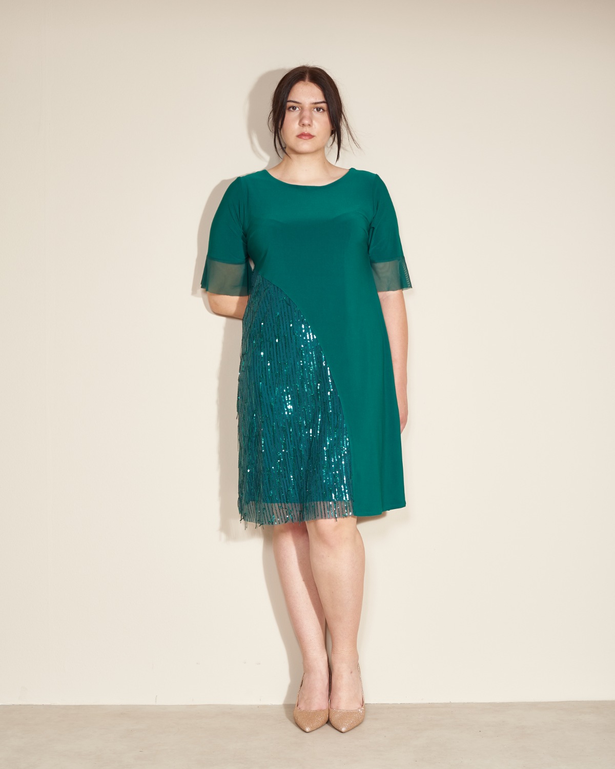 Haljina je "A" kroja te je u prednjem dijelu krasi umetak koji se proteže po desnoj strani haljine.
