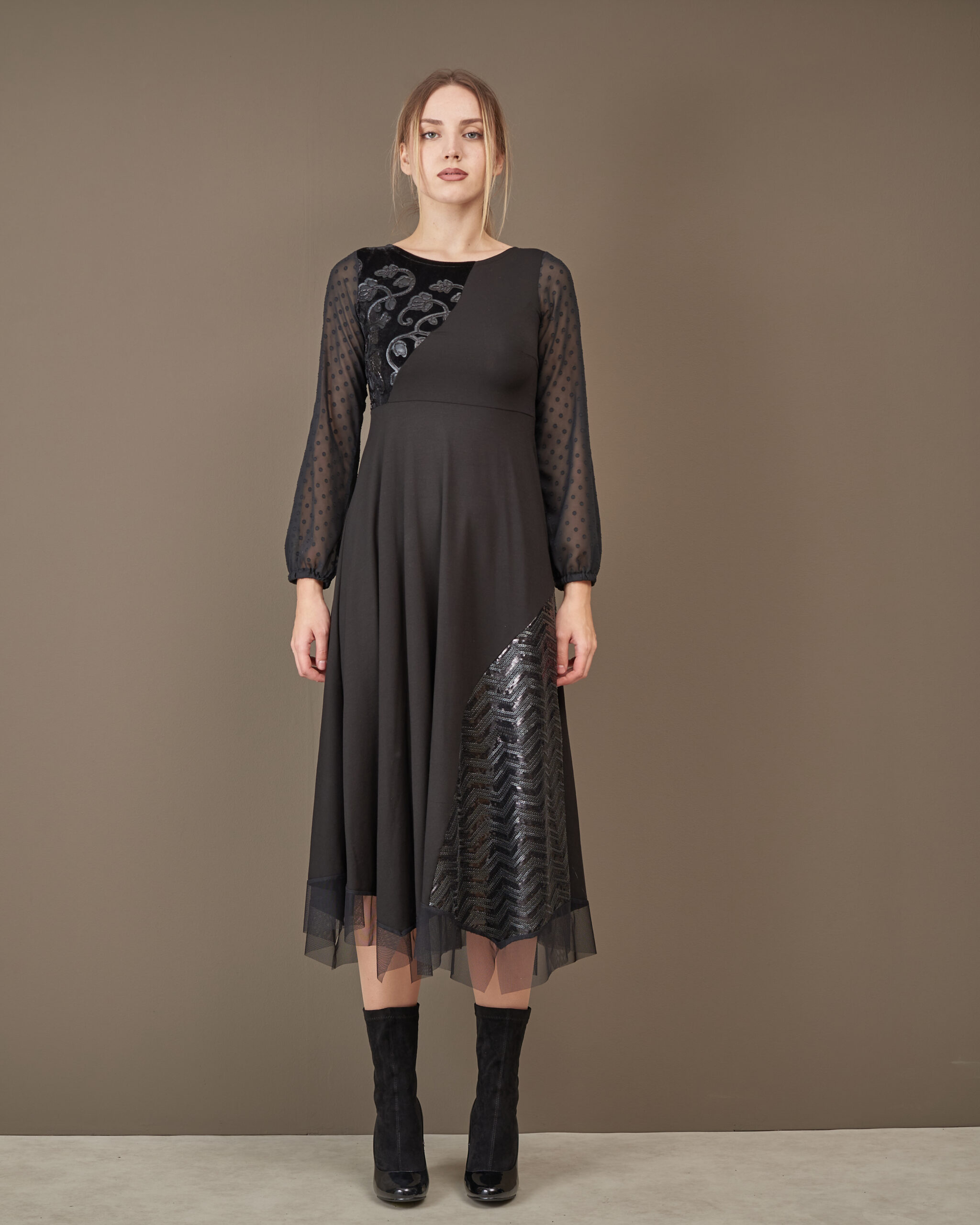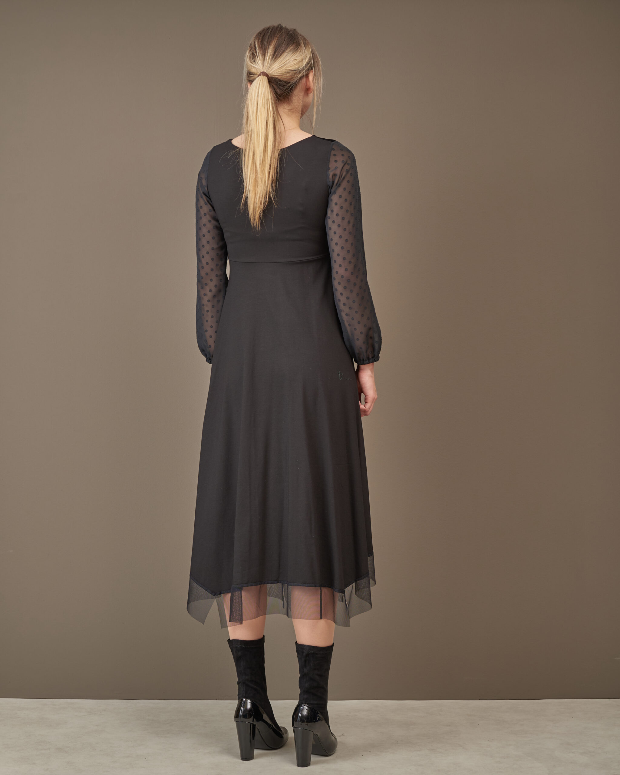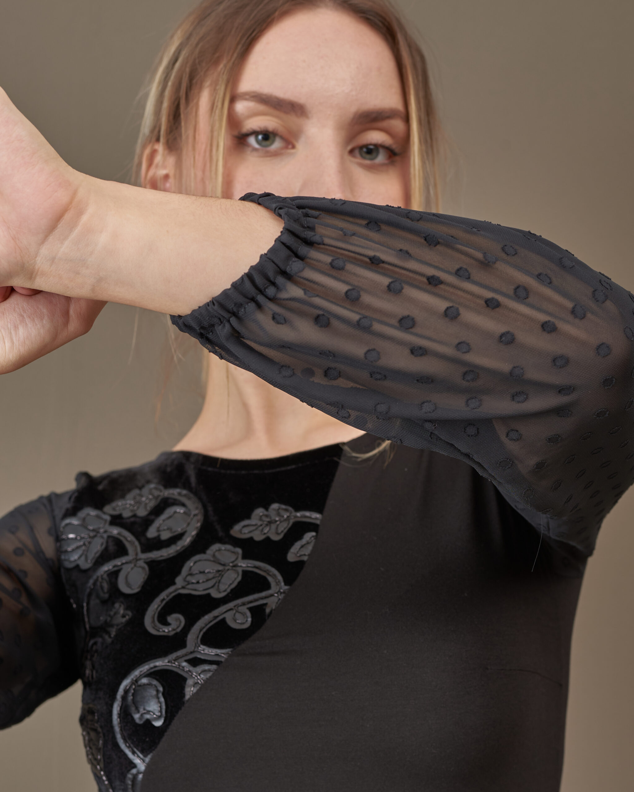 Dozu elegancije daje joj umetak od pliša u gornjem dijelu, te rukavi od crnoga tila sa točkicama.
