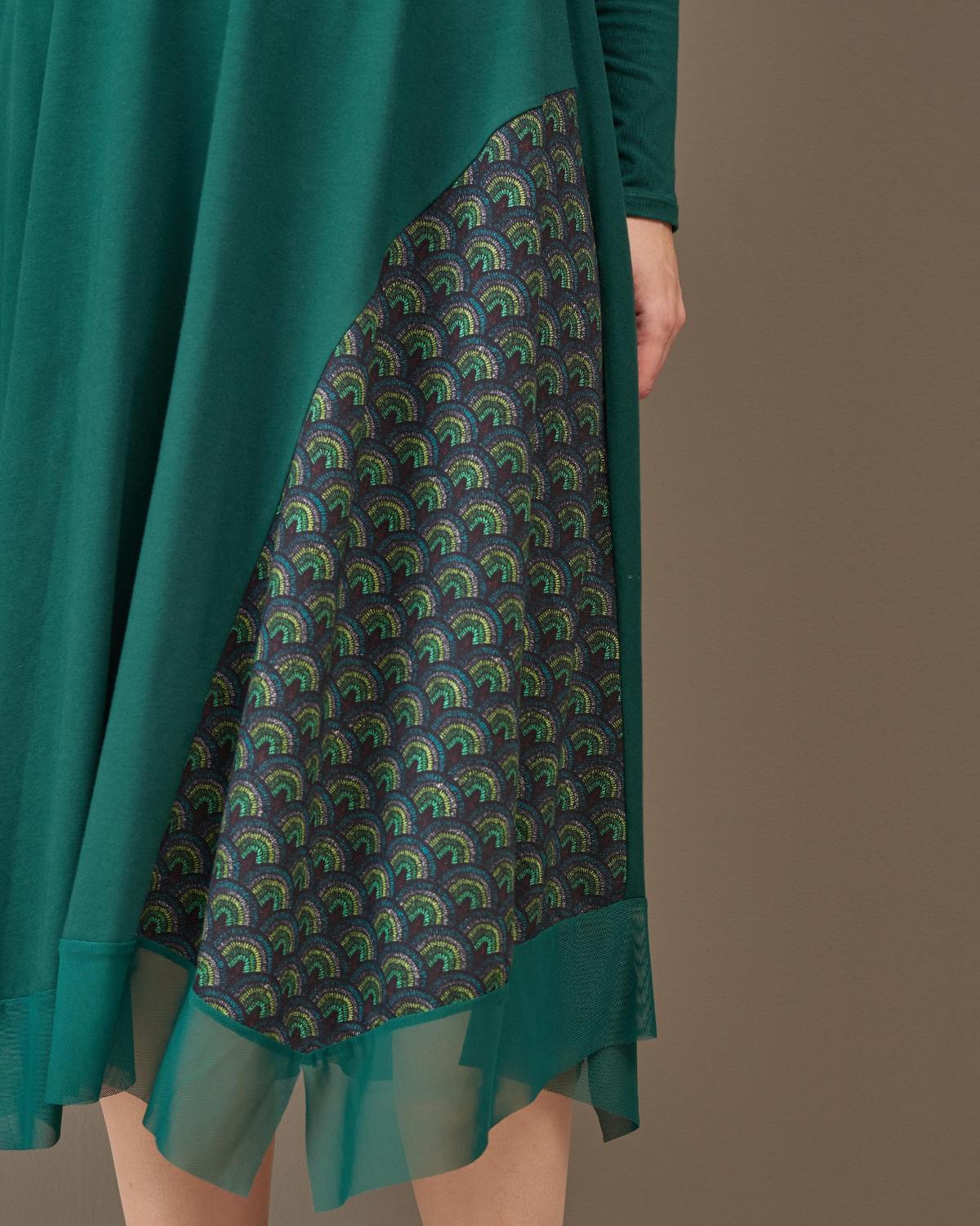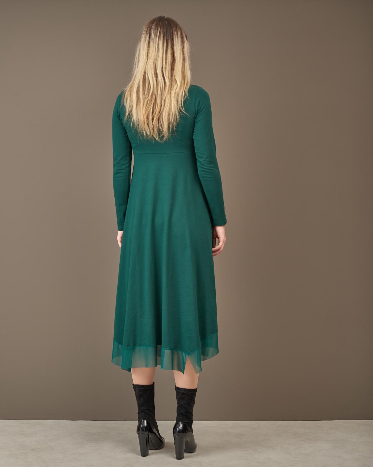 Haljina je rezana iznad struka, a završava asimetrijom.