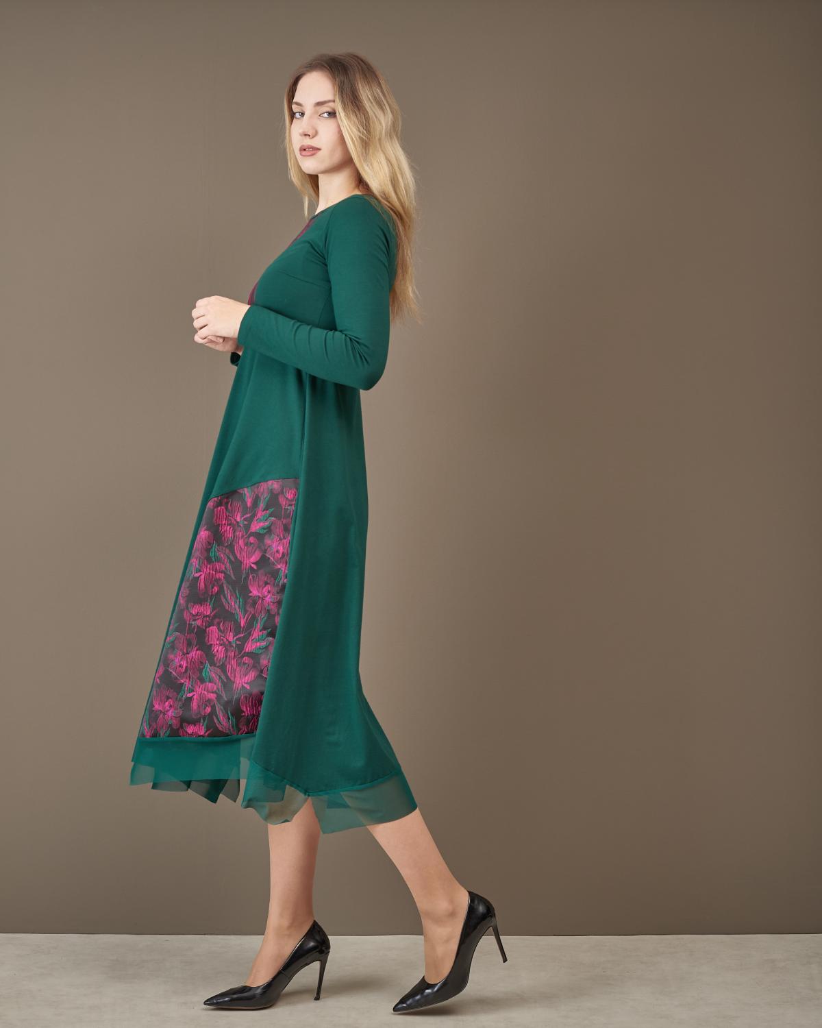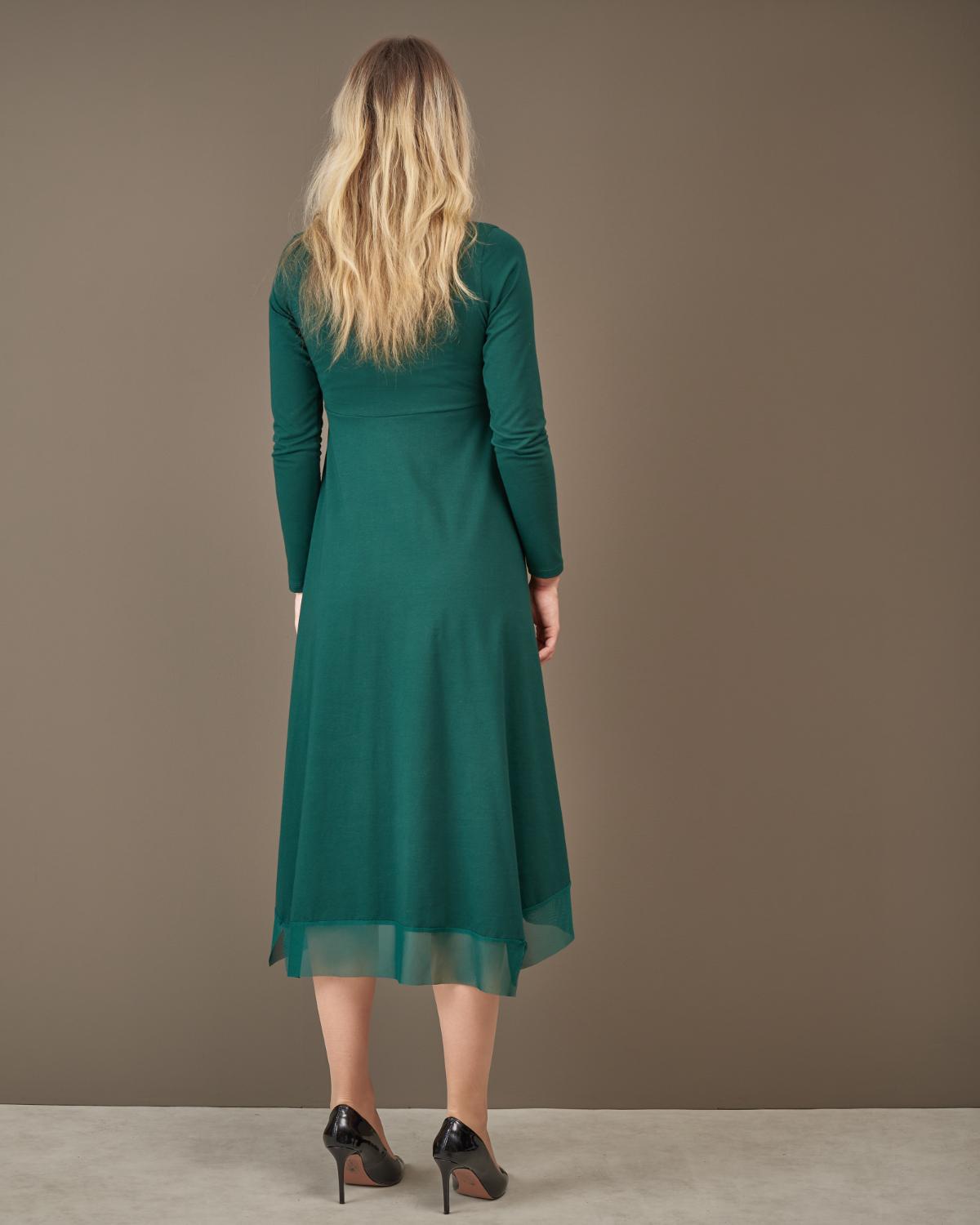 Haljina je rezana iznad struka, a završava asimetrijom.