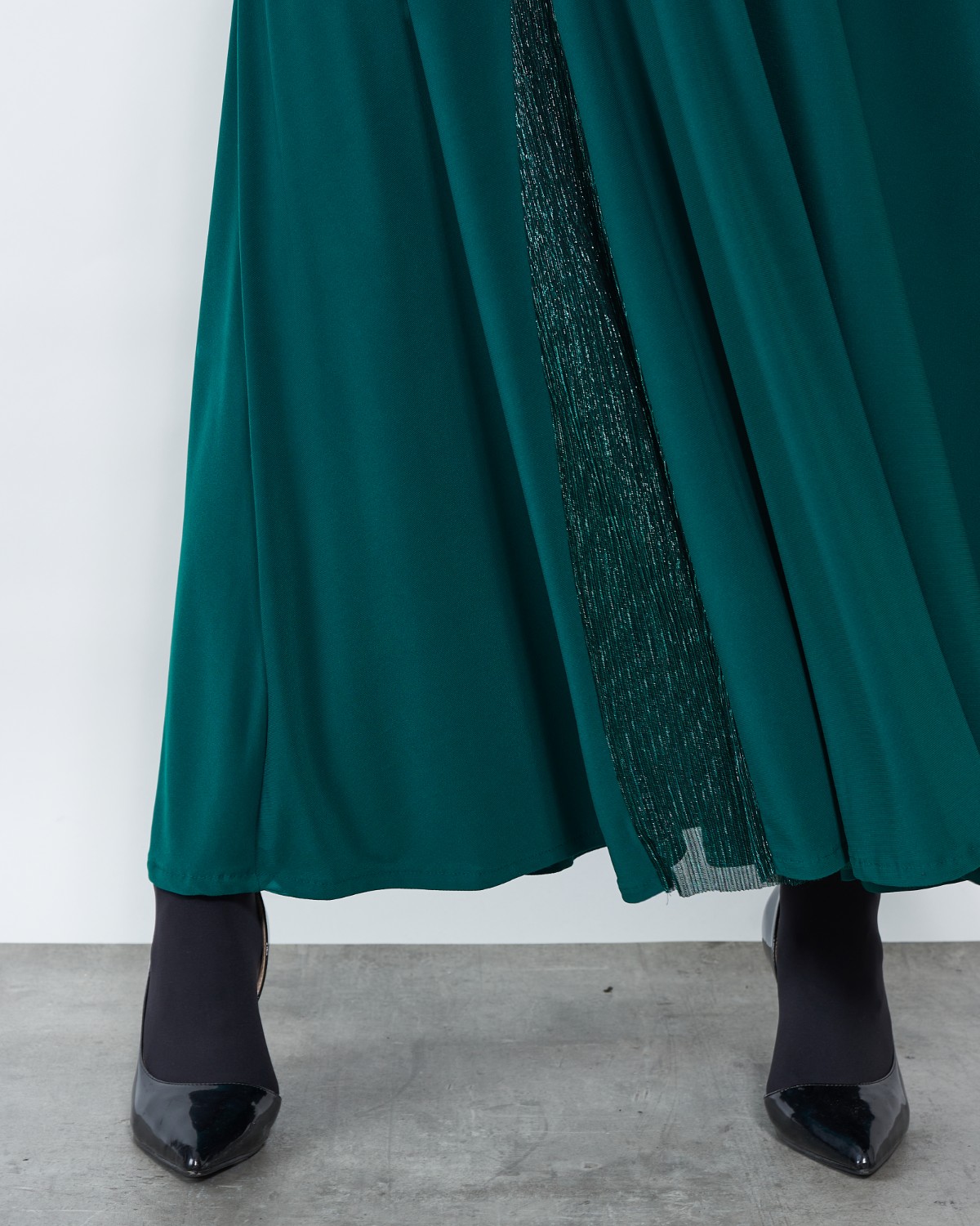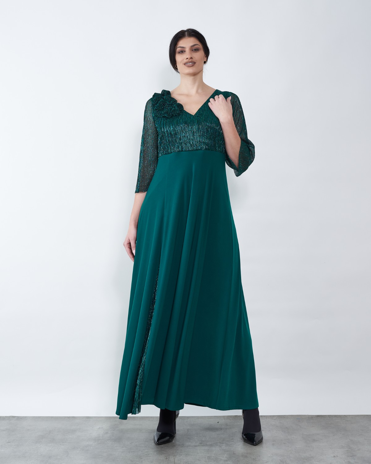 Model koji lijepo pada krasi zeleni lame, te dodatak u obliku ruže.