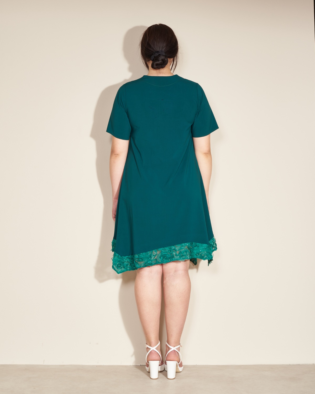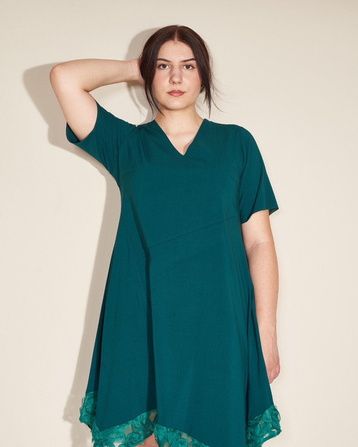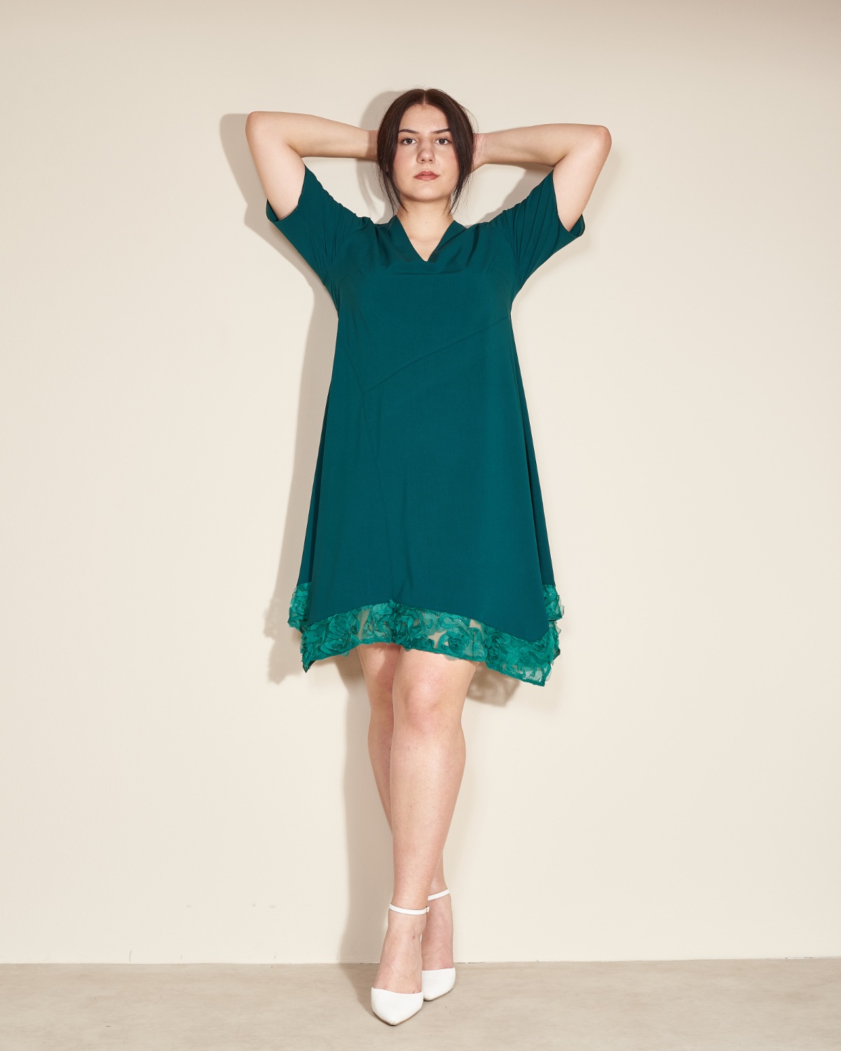 Haljinu u donjem dijelu krasi zelena čipka.