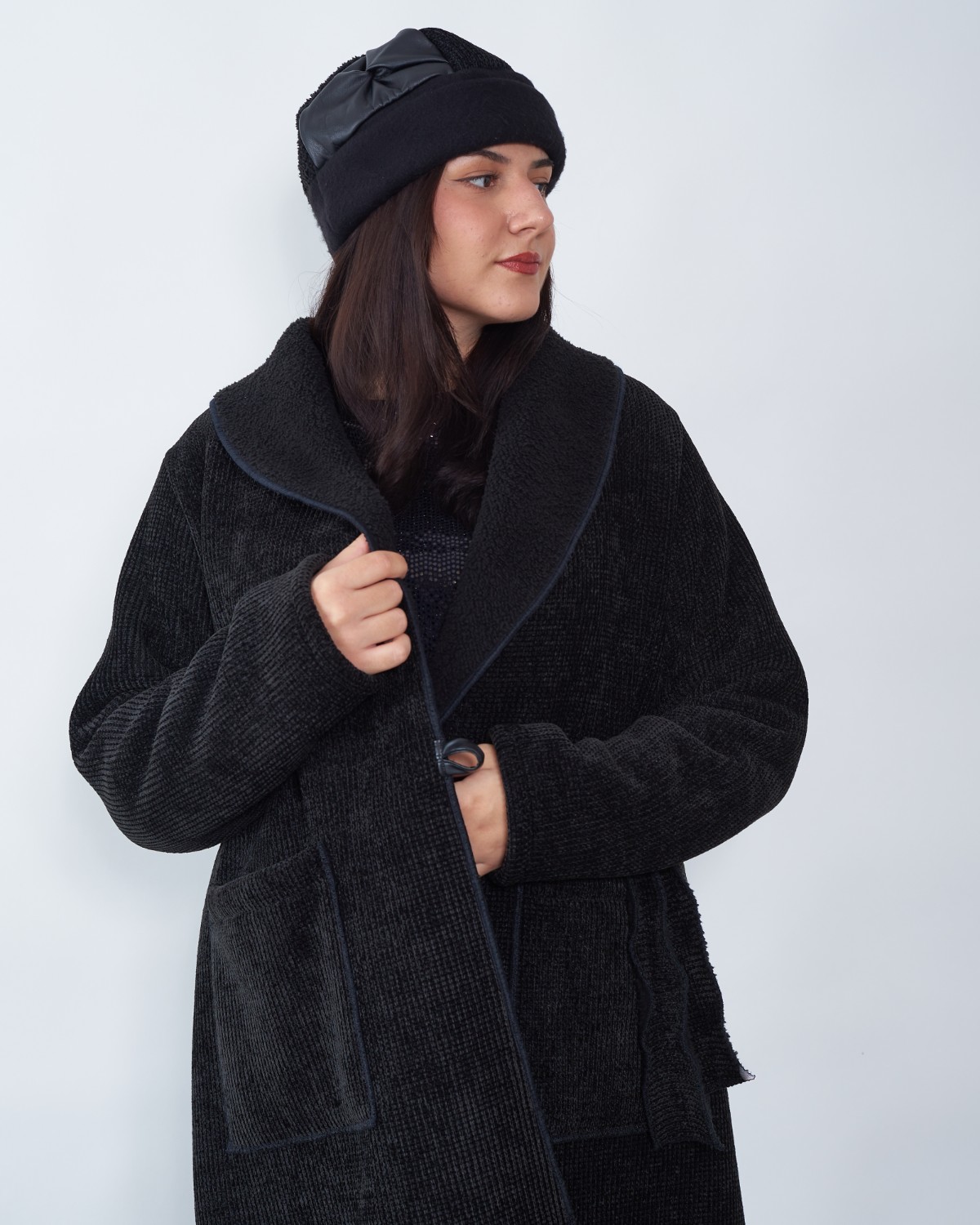 Topla zimska kapa crne boje sastavljena od različitih komada tkanine i eko kože.