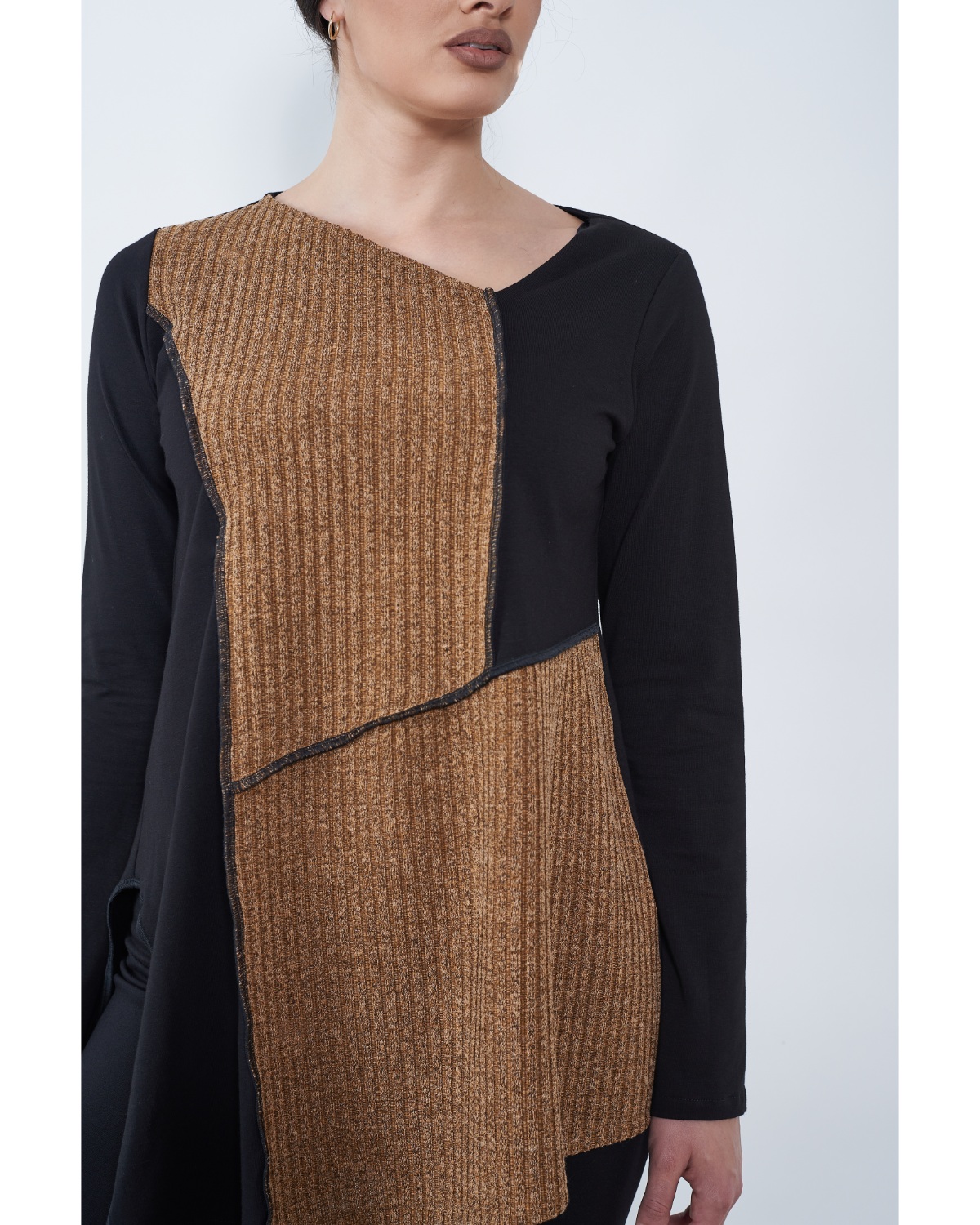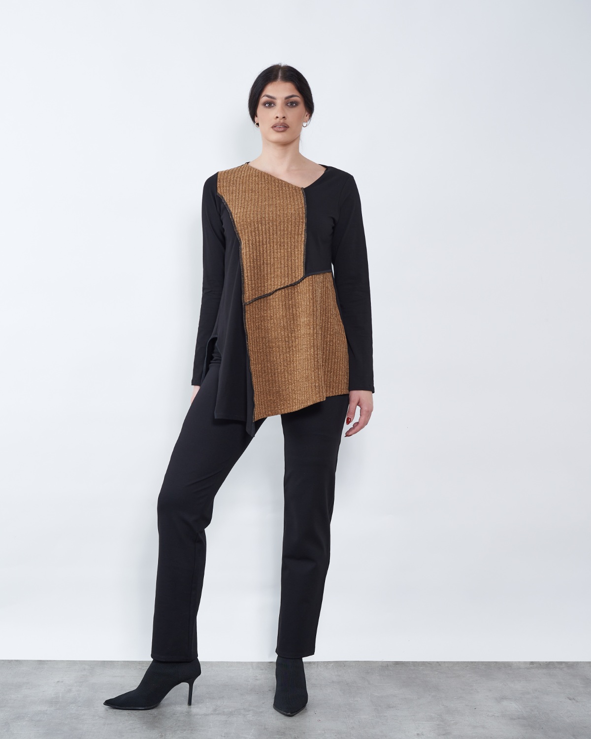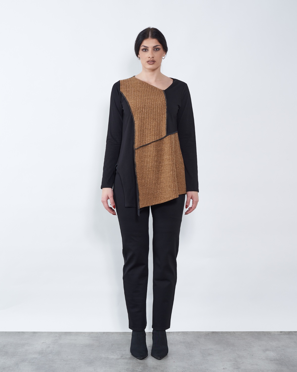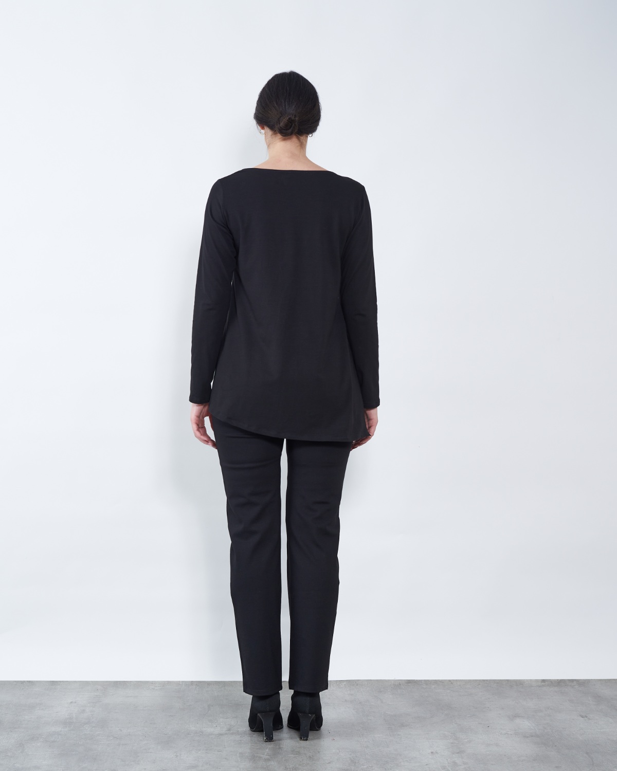 Tunika je blagog "A" kroja te završava asimetrijom.