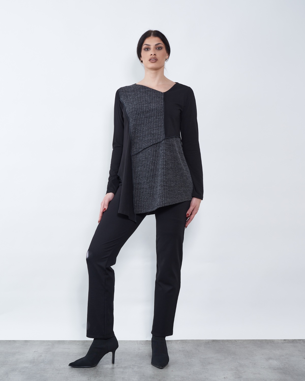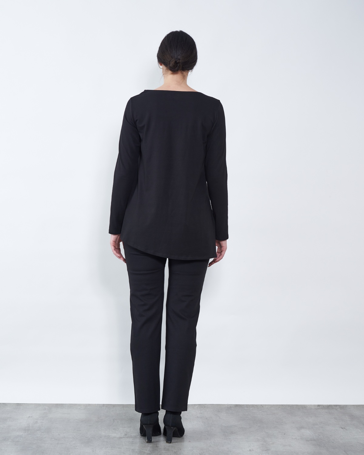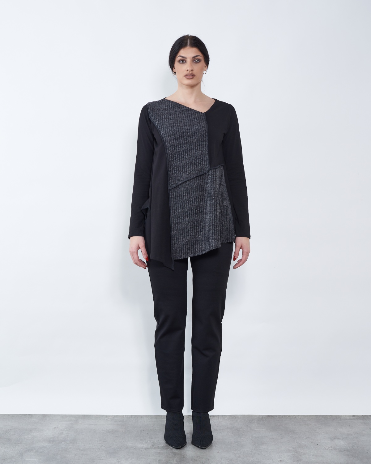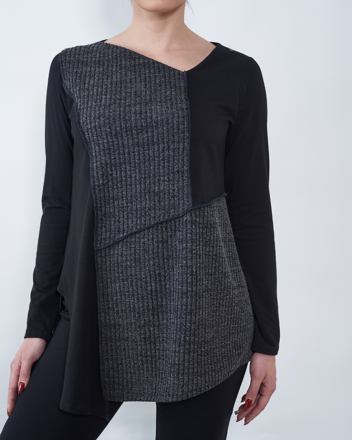 Tunika je blagog "A" kroja te završava asimetrijom.