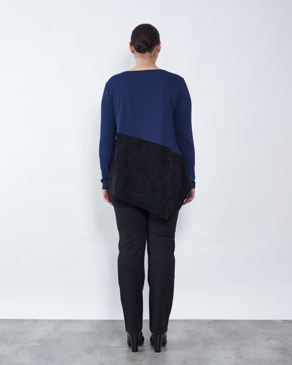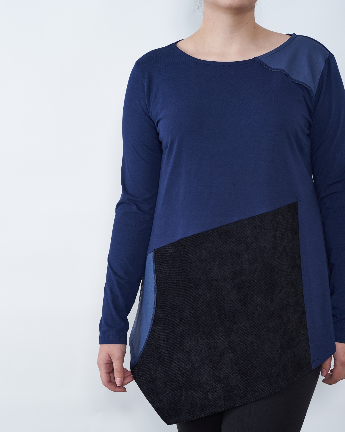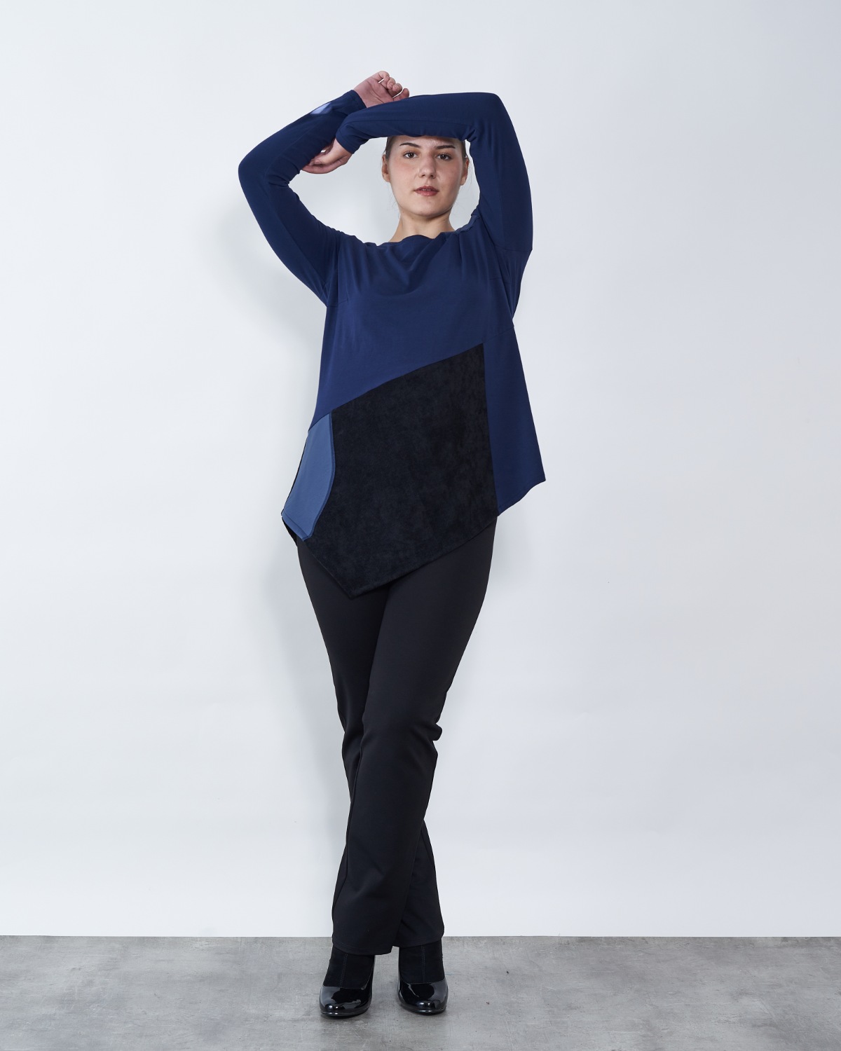 Monotonija plave boje razbijena je umetcima od crnog samta i eko kože.