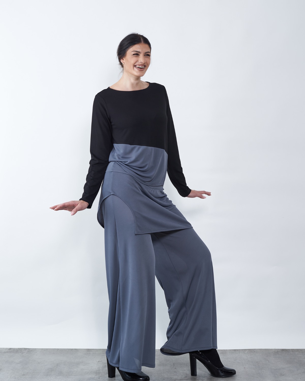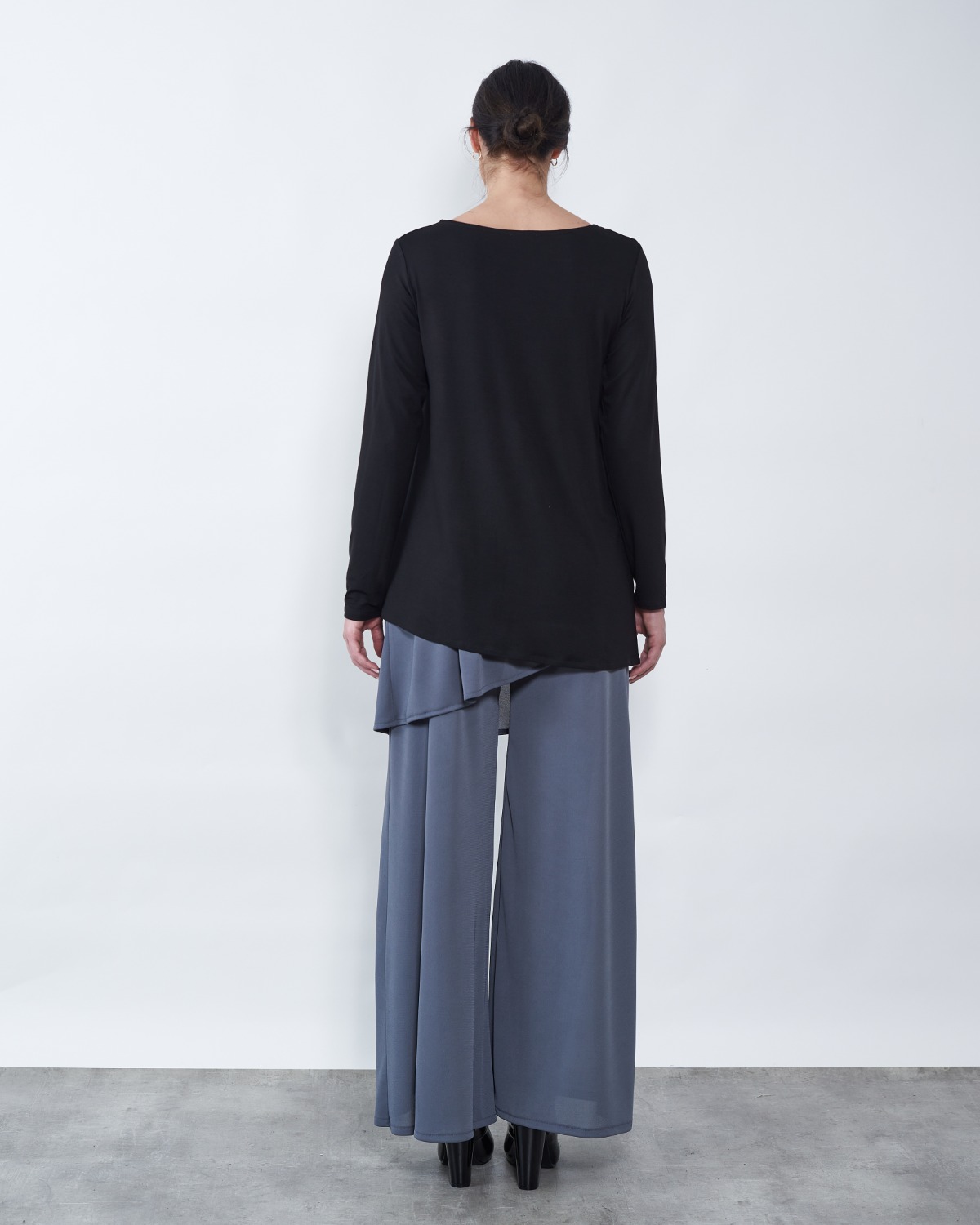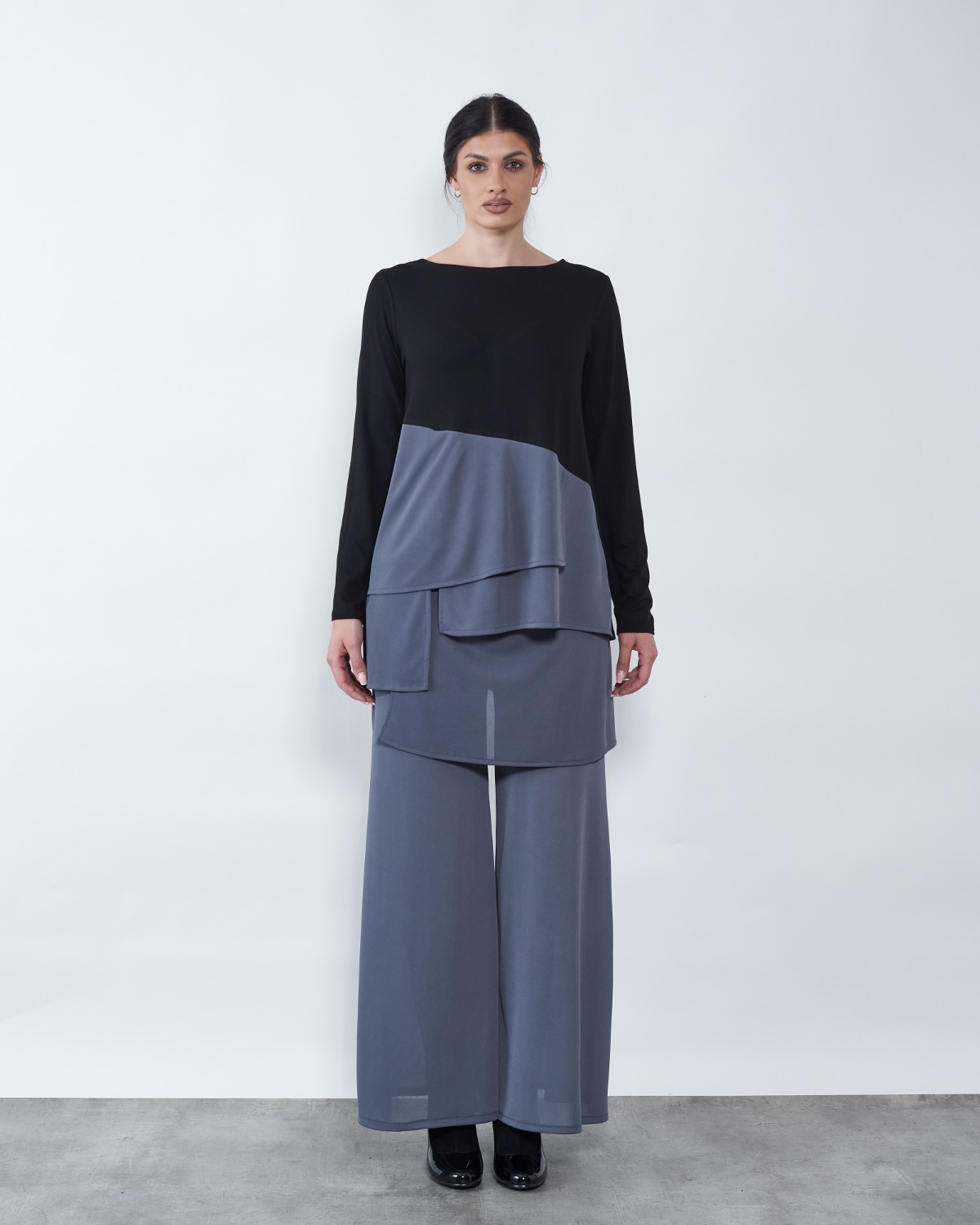 Tunika je blagog "A" kroja te završava asimetrijom..