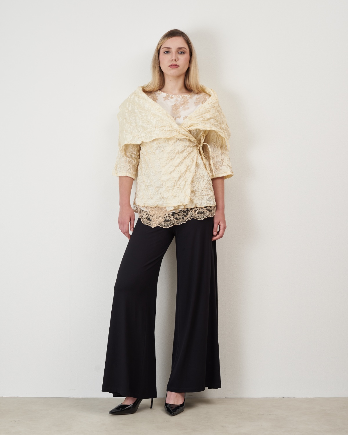 Tunika je blagog "A" kroja te završava laganom asimetrijom.