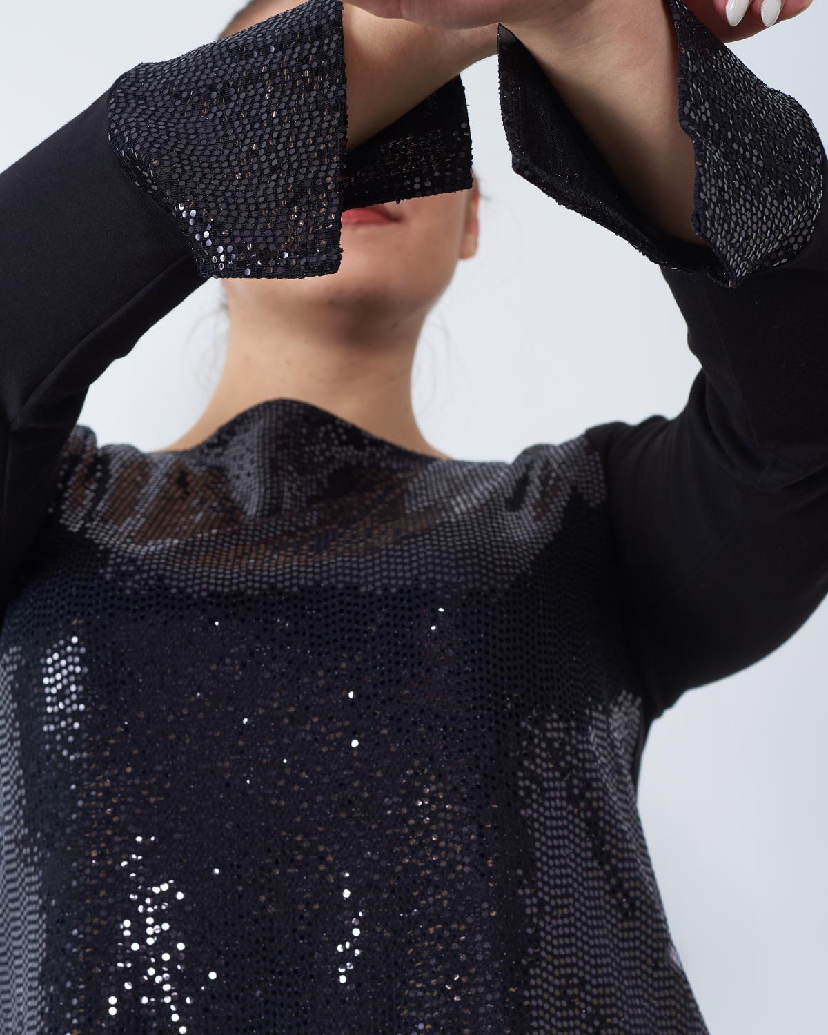 U prednjem dijelu, te na završecima rukava ističu se crne šljokice.